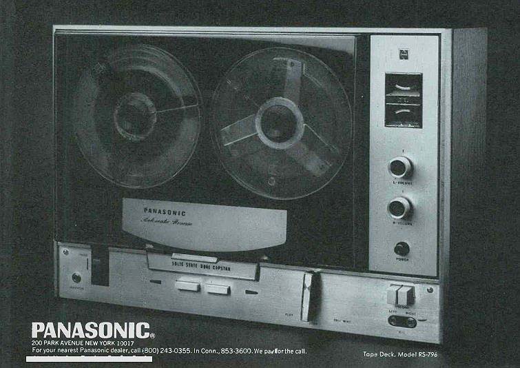 ![]() How to flip over the sound without flipping over the reel.For y ears you've flipped over a little thing called a reel. You flipped because the tape would run out at inconvenient times like 30 seconds into the Minute Waltz, or three and a half movements of your favorite symphony. Something had to be done about it. Panasonic, the world's leading manufacturer of tape recorders, did something. That something is the Panasonic Symposium. It's a Solid-State 4-track stereo deck that's unflippable. Unflippable because of continuous Automatic Reverse. You'll never flip over another reel again. And the turn around is so quick you'll hardly miss a beat. And the beat is steady. That's because there's Dual capstan drive on all three speeds. 'That way the Tijuana Brass won't sound like 76 Trombones and vice versa. Of course, if you don't want it to run forever, use the automatic shutoff. Will the Symposium match your rig at home? Yes. It has 30-20,000 hz response, and the signal-to-noise ratio is more than 52 db's plus a recording system that has an AC bias of 90kc (i.e., khz). For sound-on-sound or sound-w-sound that's plenty of fidelity. You'll be crazy about our control panel features, too. Like headphone output and Pause Control fox easy editing. Then there are two big VU meters, each sensitive enough to catch the difference between a wheeze and a whisper. Plus a 4-place digital tape counter for some of that long-distance aping you might get involved in. Top it all off with a smoked-glass dust cover that doesn’t cost extra-and everything's beautiful So why not go down to any dealer we permit to carry the Panasonic line. We think that once you hook up our Model RS-796, you can stop flipping over its reel and really start flipping over what you hear. PANASONIC 200 PARK AVENUE NEW YORK 10017 Tape Deck, Model RS-796 -------- (Audio magazine, 11/1969) Also see: = = = = |