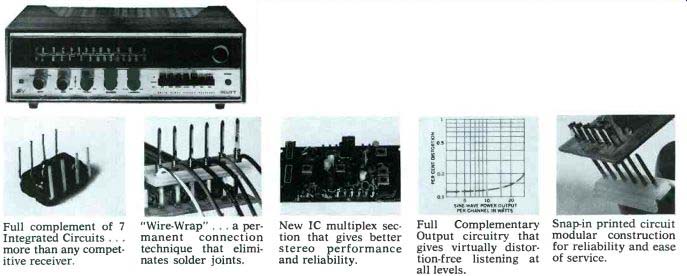 PERFECTUNE ... a tiny digital computer that flashes a light when you're tuned right ![]() Inside Scott's new 382C AM/FM stereo receiver is a specially-developed digital computer circuit called "Perfectune," that takes the fiddling, guesswork, and wasted time out of tuning ... gives you perfect sound, instantly, every time. How does it work? The Perfectune integrated circuit scans the other tuner circuits and decides exactly when you have tuned for both lowest distortion and best reception. It then flicks on the Perfectune light. Perfectune gives a far more exact reading than a meter, which may read at its highest point when the signal is masked by interference. The Scott 382C still has a meter ... but it's a signal strength meter you use only to position your antenna for optimum signal ... then you let Perfectune take over for perfect sound! Perfectune is only one of the advanced Scott features that make the 382C your best AM/FM stereo receiver buy. The photos below show some of the other Scott exclusives incorporated in this superb unit. ![]() Full complement of 7 Integrated Circuits ... more than any competitive receiver. "Wire-Wrap" ... a permanent connection technique that eliminates solder joints. New IC multiplex section that gives better stereo performance and reliability. Full-Complementary Output circuitry that gives virtually distortion-free listening at all levels. Snap-in printed circuit modular construction for reliability and ease of service. Specifications: Power (± 1 dB) 110 Watts. IHF power specifications @ 0.8% distortion, both channels driven: Dynamic power @ 4 Ohms, 45 Watts per channel; Continuous power @ 4 Ohms, 33 Watts/channel, @ 8 Ohms 25 Watts/channel. Selectivity, 40 dB; Frequency response, ±1 dB, 15-30,000 Hz; IHF power bandwidth, 15-25,000 Hz; Cross modulation rejection, 80 dB; Usable sensitivity, 1.9µV; Stereo separation, 30 dB; Capture ratio, 2.5 dB. Prices and specifications subject to change without notice. Walnut-finish case optional. Choose either the 382C AM/FM stereo receiver at $299.95 or its FM stereo counterpart, the 342C at $269.95. 1969, H. H. Scott, Inc. SINE WAVE POWER OUTPUT PER CHANNEL IN WATTS Full Complementary Output circuitry that gives virtually distortion-free listening at all levels. Snap-in printed circuit modular construction for reliability and ease of service. H.H. SCOTT For detailed specifications, write: H. H. Scott, Inc., 111 Powdermill Road Maynard, Mass. 01754. Export: Scott International, Maynard, Mass. 01754. --------