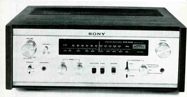 IT'S SONY. $200.Sony has placed its name on an under $200 FM stereo/FM-AM receiver--the Sony STR-6040. We broke the $200 price barrier without putting the slightest dent in quality. We did it by eliminating the un-essentials, designing an amplifier with less than a super power rating and by drawing upon advanced radar and microwave technology in the tuner design. The amplifier delivers 30 watts RMS continuous power into 8 ohms, both channels operating more than enough to drive even relatively inefficient "bookshelf"-size speaker systems to room-filling volume, without distortion. The tuner employs a completely passive front end. There is no amplification of the incoming signal frequency. This eliminates two common problems: internally generated background hiss and overloading of weak stations by strong ones (spurious-response rejection is 100 dB down). The Sony 6040 comes through with flying colors in all areas essential to superior receiver performance. Sensitivity, stereo separation, capture ratio and noise suppression characteristics are excellent. Solid-state i.f, filters are used. With their help alternate channel selectivity reaches a full 70 dB. What's more, they never require realignment. While we streamlined the 6040, we did provide a number of important operating conveniences: switches for easy selection between the most common program sources, radio or records and for instant comparison between original and recorded program material; automatic stereo/ mono circuitry; a headphone jack and an auxiliary input on the front panel; and precise tuning meter. The Sony name, Sony quality and an un-Sony-like under-$200 price tag. That's the Sony 6040, and that's beautiful music. Sony Corporation of America, 47-47 Van Dam St., Long Island City, N.Y.11101. SONY