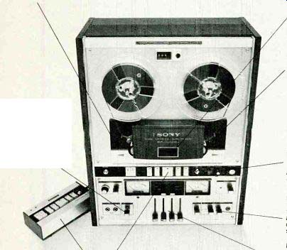Tape-Equalization Selector Switch. Get the most out of your tapes by selecting proper record-equalization curve and bias voltage matched exactly to either standard or low-noise tapes. Built-In Logic Circuit Regulates Relay-Operated Solenoid Controls. Tap the feather-touch solenoid pushbuttons for play, fast-forward, and rewind, in any order, without going into stop mode. Sony/Superscope's logic circuit "computer" ends breakage or spillage of tape under any conditions. Plug in the optional Model RM-11 full-function remote-control for push-button operation without leaving your easy chair. 6-Head Function with Sony Exclusive Roto-Bilateral Head Assembly. This unique three-head assembly is actually equivalent to 6 separate heads and provides complete recording features of tape/source monitoring, sound-on-sound, and echo in both directions of tape travel. Closed- Loop, Three-Head Tape-Drive System. Two interlocked capstans provide perfect tape tension and tape-to-head contact in both directions. The three-speed Servo-Controlled drive motor maintains precise tape speed regardless of variations in AC power. Electronic Sensory Search, Another Sony exclusive-put on your favorite prerecorded tape and press the ESS button. The Model TC-780 switches to fast-forward, precisely locates the beginning of the recorded material, stops, and shifts to playback mode. All automatically. No long leader-tape delay. Separate Headphone Controls. Full monitoring flexibility is assured with a three-position volume control and separate mode selector switch for left channel only, right channel only, or stereo. Mic/Line Mixing. Four separate professional-type slide controls regulate the recording levels for both microphone and line inputs. Sony/ Superscope Model 780. $695, with walnut base and vinyl dust cover. If you prefer a custom-console installation, the transport and electronics sections of this unit can be separated and individually mounted. For your free copy of our latest color catalog, please write Mr.Phillips,Sony/Superscope, 8142 Vineland Ave., Sun Valley, Calif. 91352. 1969, SUPERSCOPE, INC. SONY, SUPERSCOPE. You never heard it so good. ===== ![]() How to recognize a stacked deck. The Choice of Experts. This is the famous Sony Model 355 selected as a "best buy" by the nation's leading consumer reporting service. Unprecedented Specifications & Features. Achieves true high-fidelity performance even at slower speeds: (20-22,000 Hz at 7 1/2 ips, 20-17,000 Hz at 3 3/4 ips, 20-9,000 Hz at 1 7/8 ips). Three speeds, 4-track stereo and mono recording and playback, 7-inch reels, Automatic Sentinel Shut-off, two VU meters, stereo headphone jack, pause control, four-digit tape counter, record interlock, vertical or horizontal operation. Instant Tape Threading & Vibration-Free Motor. Exclusive Sony Retractomatic pinch roller permits simple, one-hand tape threading. Automatic tape lifter protects heads from wear during fast-forward and reverse. Vibration-free motor is completely isolated from tape mechanism by exclusive Sony "floating" shock-absorber action. Three Heads. Three-head design permits such professional features as tape/ source monitoring and sound-on-sound. Exclusive Sony circuit eliminates record-head magnetization build-up, the most common cause of tape hiss. Noise-Suppressor Switch. Special filter eliminates undesirable hiss that may exist on older recorded tapes. Scrape Flutter Filter. Special precision idler mechanism located between erase and record heads eliminates tape modulation distortion. Formerly found only on professional studio equipment. Sony Model 355. Priced under $229.50. For a free copy of our latest catalog, write to Mr. Phillips, Sony/ Superscope, Inc., 8142 Vineland Avenue, Sun Valley, California 91352. SONY a You never heard it so good. SUPERSCOPE. ========== ![]() When you're number one in tape recorders you don't make the number-two tape. It costs a few pennies more. But Sony professional-quality recording Tape makes a world of difference in how much better your recorder sounds-and keeps on sounding. That's because Sony tape is permanently lubricated by an exclusive Lubri-Cushion process. Plus, its extra-heavy Oxi-Coating won't shed or sliver. Sony tape is available in all sizes of reels and cassettes. And remember, Sony professional-quality recording tape is made by the world's most respected manufacturer of recording equipment. SONY. You never heard it so good. SUPERSCOPE.INC. SONY, SUPERSCOPE, Sun Valley, California, 91352 -------- (Audio magazine, 11/1969) Also see: = = = = |
