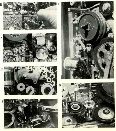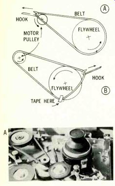 Fig. 2-Speed of a flywheel is not in inverse ratio to the diameters of motor pulley and flywheel, but has to take into account the thickness of the belt. ![]() ------------Fig. 3--(A) A simpler method of loading a new belt where surfaces are accessible. The hook is used to maintain tension. (B) Where other parts of the mechanism overlay the pulleys, a better method is to put the belt over the smaller diameter, secure at the rotational entry point, and use the hook to feed the belt over the larger diameter while turning gently. (A) Combination belt-and-pulley drive is used on many machines, as in this example-Sony TC-250. (B) Flat wide belts may suffer from impregnation; small particles of metal from pulleys become embedded, imparting a surface polish. This example is a Sony CV-2000 video tape recorder. (D) This assembly from a West German pocket portable uses a number of plastic pulleys with thin rubber tires. Check for binding bearings and out-of-line spindles. (E) Japanese Standard portable has edge drive from motor to flywheel and rim-drive from flywheel to take-up. (F) Examples of the wide, thin take-up idler on a loose bracket which is liable to misalignment, and the smaller soft-tired auxiliary wheel at right. Philips 3548. (G) Ramped idler for speed change. ----- This is dependent on the ratio of the motor to flywheel diameters, in the case of direct drive. Interposing an idler reverses the direction of rotation, but should have no effect on the speed. In practice, small changes in diameter upset the tensioning, the wedge angle, and the calculated amount of slippage and can cause a slowing down or irregularity. Belt Faults Many of the factors governing regular running with idler-wheel drive also apply to belt-drive systems. Small variations in belt thickness can have a large effect on tape speed. The thickness of flat belts is more easily controlled than the diameter of round ones. Importance of exact belt diameter or thickness is illustrated with reference to Fig. 2. If the motor pulley were geared to the driven pulley, the speed reduction at the capstan would be in inverse proportion to the diameters, i.e. n1/n2 =D2 D1. Taking a practical example, a belt-driven flywheel 95.5 mm in diameter is required to rotate at 300 r.p.m. The available motor rotates at 2900 r.p.m. If a thickness of belt is 1 mm this must be added to each diameter in the above equation, giving So the effective drive at the motor has a diameter of 10mm. Suppose there is a variation of 10 per cent in belt thickness over its length. The resulting speed variation will be 0.1 x 100/10 or 1 percent. The running frequency of the belt is only a few cycles and speed variations of such a low frequency can hardly be equalized by the centrifugal mass, so wow will be heard from pitch variations. -------- thus n, D,+d n, D,+d D,= n.(D,+d) n, 300x96.5_1 2900 = 9mm. ------------- If a flat belt is used, closer limits can be gained, and by hardening, then grinding the flat surfaces, deviations of less than 0.5 per cent can be achieved. From the foregoing it also appears that the larger the diameter of the motor pulley the less the effect of these deviations will be, but this has practical limits. This would require a slow-running motor, or a centrifugal mass (flywheel) of large diameter, or the addition of an intermediate drive wheel. We are back where we began. Speed changing with belt drive can present special problems. The usual method is to feed the belt from one diameter to another on a common motor pulley. A fork drive may be used, or a tongue on the pulley. One advantage of belt drive on simpler machines is the ability to filter out minor variations inherent in the system. Motor hum vibrations at 60 Hz can be reduced considerably by using a belt of sufficient elasticity to form an absorption circuit. This is very useful when a motor with an outer rotating cage (small diameter pulley) is employed in conjunction with a flywheel. The small diameter is dictated by the high rotational speed. Flywheel rotation should be as high as is practicable, and the short-term speed variations can be formidable unless belt elasticity is carefully chosen to filter them out. It follows that any hardening of the belt or loss of elasticity due to temperature and humidity changes will also affect drive regularity. Neglect is the prime culprit-as has already been emphasized in this series of articles.. Belts that are left in one position tend to harden and form to a shape, with flattened portions at the contact sections. The cure is a regular use of the machine, but if the condition has already set in, some remedy may be possible by heating and running the belt. Best method of rejuvenating a formed rubber belt is to let it stand for a while in hot water, dry it, powder with French chalk or talcum, clean off surplus talcum to prevent it mixing with lubricants, and "run the belt in" for a reasonable period. Mention of lubricants brings us to the prime enemy of belts-and indeed of any rubber or composition drive surfaces, including idler-wheel tires. This is oil or grease. Over-enthusiastic lubrication has caused more erratic tape drive than any other single fault. Oil tends to spin off rotating bearings in a fine film; grease can have a capillary action when heated, creeping up to idler surfaces. Always oil sparingly, and wipe any surplus from spindles before fitting belts or idler wheels. Diluted alcohol is the best cleaning agent, but even this has to be used with care on some composition materials, which can soften by its solvent action. Refitting drive belts can face us with some problems. One or two tricks of the trade can make the job easier. The first thing to remember is sequence. Unless you know the machine so well that dismantling deck parts becomes habitual, keep a note of the order in which parts are removed. Lay the parts in a logical sequence, ready for re-assembly.. Make drawings where necessary, and always include some sort of da