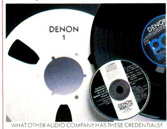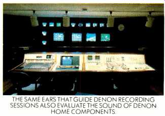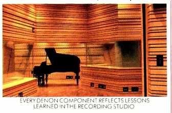 -------------The Atelier system of electronic components. From top to bottom, the R4, the CD4 compact disk player, the C4 cassette deck and the PA4 power amp. That's even an Atelier storage module they're sitting on. Test them for yourself. --------------------- Denon Other audio engineers may listen to live music. Denon engineers also record it. Denon. Where playback components are designed by recording engineers. For the typical audio engineer, live music offers a chance to get reacquainted with the ultimate reference in audio reproduction. But for Denon audio engineers, live music represents an essential part of their day-to-day experience. ![]() Every month, from the Semper Opera House in Germany to Clinton Studios in America, from Aoyama Tower Hall in Tokyo to The Hall of Artists in Prague, Denon audio engineers are producing records. In this exacting enterprise, nothing is overlooked. Microphone selection and placement. Hall reverberation and stereo imaging. Tonal balance. Phase integrity. Our technicians control, discuss and sometimes fight about every factor that determines sound quality. In the process, Denon audio engineers have created award-winning operatic, symphonic, vocal and jazz recordings. They've developed an unrivalled sensitivity for the integrity of live music. And they've acquired technical expertise that fuels the advancement of Denon studio recorders, broadcast equipment, blank recording tape, and Denon audio components for the home and the car. Look inside a Denon component and you'll find tangible evidence of our work in the recording studio. The Super Linear Converter in every Denon CD player is a direct outgrowth of Denon's early research into studio digital recording. The Non-Slip Reel Drive of Denon cassette decks reflects years of mastery in building open-reel machines. Even Denon receivers demonstrate this heritage. Their circuit design results from Denon experience at achieving playback accuracy in the recording studio. More than circuits and transistors, our studio expertise defines a philosophy. It dictates the uncompromising pursuit of better sound, the obsessive concern for musical nuance, and the eagerness to subject new designs to intensive listening tests. At Denon, this symbiosis of recording and playback technology is nothing new. It dates back to the founding of our parent company in 1910. It stands behind Denon's reputation among the world's audiophiles. And it explains the rave reviews we've received from the world's audiophile magazines. On the pages that follow, you'll see some of those reviews and learn about the Denon components that earned them. But no amount of words will substitute for the evidence of your own ears. ![]() ![]() ![]() ![]() ![]() ![]() ![]() ![]() ![]() ![]() ![]() ![]() Your Denon dealer has all the expertise necessary to explain Denon audio clearly. And all the facilities to demonstrate Denon audio properly. So you can hear for yourself one simple truth. It's a lot easier to make audio sound like live music when you know what live music sounds like. How a 77-year-old became the first name in digital audio. ---EVERY DENON COMPONENT REFLECTS LESSONS LEARNED IN THE RECORDING STUDIO. Denon's been involved in every phase of music reproduction since the days of wind up record players. So after seven decades of break throughs in studio recording, disc pressing, home high fidelity and professional equipment, we were uniquely prepared to take the next step. A tape recorder so fundamentally different, it would obsolete every previously accepted notion of how good recorded sound could be. ---WHAT OTHER AUDIO COMPANY HAS. THESE CREDENTIALS In 1972, Denon researchers achieved their goal. The world's first digital recorder worthy of commercial record production, the legendary Denon DN-023R. We quickly put our digital innovation to use, producing digital processors, digital editors, digital mixers, and the world's first digitally recorded LPs. THE NEW DCD 1500II-- ITS' SUPER LINEAR CONVERTER Today, Compact Disc players, regardless of brand, reflect the influence of the original Denon DN-023R. But this heritage runs strongest in CD players from Denon. Because the same engineers who design Denon pro machines design Denon home audio. And the same ears that guide Denon recording sessions evaluate the sound of Denon playback components. Perhaps that's why each succeeding generation of Denon CD players is eagerly anticipated by the world's audio critics. And why they've variously hailed our CD players as "a winner on every count; "the player I recommend most highly," "superlatives have to be used; and "in several respects, the best I've ever heard: Reactions which simply demonstrate one point. It's a lot easier to make audio sound like music when you really know what music sounds like. What happens when studio recording engineers also design home tape recorders. What qualifies a company to build audiophile cassette decks? Try seven decades of intimate knowledge in every aspect of the recording process. Creating award-winning blank tape. Recording award-winning classical and jazz releases. ---THE SAME EARS THAT GUIDE DENON RECORDING SESSIONS ALSO EVALUATE THE SOUND OF DENON HOME COMPONENTS. Building transcription-quality open-reel recorders, multi-track decks for studio work, and finally the world's first digital recorder good enough for commercial record production. Only one company has all these qualifications. That company is Denon. ---- A CASSETTE DECK IS ONLY ONE HALF OF THE RECORDING SYSTEM. HERE'S THE OTHER. Consider Denon's DR M3OHX Cassette Deck. This machine's professional heritage is evident in the three-motor drive system for flawless tape movement, the high-overload heads with oxygen-free copper coils for the barest minimum noise, and the wideband DC playback amplifier for ruler-flat ply has separate windings for the audio circuits-for absolute minimum distortion. Although not highly publicized, the control of supply reel back