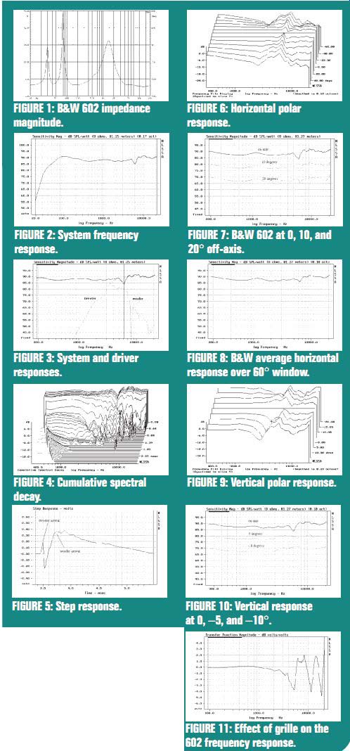 | ----------------------- ![]() Reviewed by Joseph D'Appolito I ran a series of impedance, frequency response, and distortion tests on the B&W 602 S2 loudspeaker. Figure 1 is a plot of system impedance magnitude. At low frequencies the plot displays the double-peaked curve of a vented system. The impedance minimum of 5.55 ohm at 42Hz indicates the vented-box tuning frequency. There is a second local impedance minimum of 5.1 ohm at 162Hz. Impedance phase lies between +47° and -55° over the full audio range. Fortunately, these rather large phase angles occur at relatively high impedance values. With minima in the range of 5 ohm, B&W's 8 ohm rating for this system seems a bit high. FREQUENCY RESPONSE Figure 2 shows the 602's full-range frequency response, which I obtained as a combination of the far field quasi-anechoic response and properly summed near-field woofer and port responses. I placed the microphone along the tweeter centerline at a distance of 1.25m to produce the far-field response. I then spliced together the near and far-field responses at 200Hz to produce the full-range response1. The response shown in Fig. 2 has been normalized to 1m to obtain system sensitivity. Sensitivity averages 87.9dB in the two octaves between 500Hz and 2kHz. This is about 2dB less than the figure quoted in B&W's specs. Relative to this level, the low frequency -3dB point is 48Hz. Response shelves up above 7kHz by 3dB. There is also a broad response peak of about 2dB centered on 100Hz and a sharp response dip of 3-5dB centered on 6kHz. Finally, an ultrasonic peak of 9dB at 24.8kHz (not shown) is due to the tweeter's "oil can" resonance. The 602 has two pairs of binding posts for bi-wiring. This allowed me to measure the response of the individual drivers. The result is plotted in Fig. 3. The crossover frequency is seen to be 3500Hz. Notice that the tweeter response is quite smooth. The woofer that is out of phase with the tweeter at this point causes the sharp system response dip at 6kHz. B&W claims that the crossover is fourth-order, but it is clear that woofer response is not falling off anywhere near that fast in the first octave above crossover. I suspect that the woofer response peaks in this frequency region. CUMULATIVE SPECTRAL DECAY The 602's cumulative spectral decay (CSD) response (Fig. 4) shows the frequency content of the system response following a sharp impulsive input at time zero. On the CSD plot, frequency increases from left to right and time moves forward from the rear. Each slice represents a 0.05ms increment of time. The total vertical scale covers a dynamic 32dB range. Ideally the response should decay to zero instantaneously. Inertia and stored energy that take a finite amount of time to die away, however, characterize real loudspeakers. A prominent ridge parallel to the time axis would indicate the presence of a strong system resonance. The first time slice in Fig. 4 (0.00ms) represents the system frequency response. Tweeter decay time is good, but there is a strong woofer resonance mode at 7kHz that rises out of the background beginning at about 0.44ms. This ridge indicates the presence of a woofer response peak, which in turn, prevents the woofer from rolling off rapidly just above the crossover frequency and leads to the response dip. WOOFER/TWEETER TIMING The sharp first positive peak in the 602's step response (Fig. 5) indicates the tweeter arrival at the test mike. The second (more slowly rising) peak indicates the woofer arrival. This plot tells us that tweeter and woofer are wired in phase, but it also shows that the 602 is not time coherent. The excess group-delay plot (not shown) reveals that the woofer arrives at the listening position 200µs later than the tweeter. POLAR RESPONSE Figure 6 is a waterfall plot of horizontal polar response in 10° increments from 60° right (-60°) to 60° left (+60°) when facing the speaker. All off-axis plots are referenced to the on-axis response, which appears as a straight line at 0.00°. Thus, the plotted curves show the change in response as you move off-axis. For ... ------------------------- ABOUT THE AUTHOR Joseph D'Appolito, regular contributor to SB and author of many papers on loudspeaker system design, holds four degrees in electrical and systems engineering, including a Ph.D. Previously, he developed acoustic propagation models and advanced sonar signal processing techniques at an analytical services company. He now runs his own consulting firm specializing in audio, acoustics, and loudspeaker system design. A long time audio enthusiast, he now designs loudspeaker systems for several small companies in the US and Europe. -------------------------------- ... good stereo imaging the off-axis curves should be smooth replicas of the on-axis response with the possible exception of some tweeter rolloff at higher frequencies and larger off-axis angles. With the exception of the off axis peak at 6kHz, horizontal response is quite uniform out to ±30°. The on-axis response dip at 6kHz tends to disappear as you move off-axis. This causes an off axis peak in the polar response curves that are plotted relative to the on-axis response. An alternate view of horizontal polar response (Fig. 7) plots responses on-axis and at 10° and 20° off-axis. Note the smaller response dip at 6kHz and reduced upward shelving above 7kHz at the off-axis angles. The average response over a 60° horizontal angle (±30°) in the for ward direction is shown in Fig. 8. The dip at 6kHz is greatly reduced. Shelving of the average forward response above 7kHz is also reduced somewhat relative to the on-axis response. This may make the audible effect of the shelving less apparent, since the human ear integrates direct and reflected sound when judging the overall spectral balance of a loudspeaker. On balance, however, the frequency range between 500Hz and 6kHz is depressed relative to the response at the frequency extremes. This might make the 602 sound some