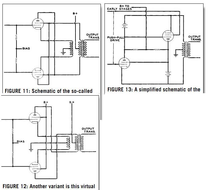 | AUDIO CLASSROOM, PT. 6B -- This noted audio teacher wraps up his discussion of which circuit to use in your amplifier design. -------------- By Norman H. Crowhurst Designing Your Own Amplifier Part 6b: Special Output Circuits This article originally appeared in Audiocraft, March 1957. 1957 by Audiocom, Inc. A variant of the pentode cathode follower circuit is the unity-coupled circuit used by McIntosh, and shown schematically in Fig. 11. Half the output load is put in the plate circuit and half in the cathode circuit, using an equal number of turns in each. By cross-coupling the screens, the screen-cathode potential is maintained constant during the audio cycle, as with the straight cathode-follower pentode. It is important that the screen be tightly coupled to its corresponding cathode. For this reason the screen-and plate winding is wound bifilar with the cathode winding; that is, the turns of both are put on side by side at the same time. Good insulation is needed between these individual turns, since the voltage between them is full B+. DC voltage on the screen will be the same as the plate voltage, as in the ultralinear method of operation. The drive swing will be a little more than half that required for the pentode cathode follower, since it will be made up of half the plate plus the full grid swing. The reduction in harmonic distortion would also be about half that obtained in the cathode follower, resulting in about 0.5% without any overall feedback. Source resistance will also be about double that of the full cathode-follower pentode circuit. CATHODE-COUPLED ULTRALINEAR Another variant may be regarded as an ultralinear circuit with partial cathode feedback. This is shown schematically in Fig. 12. The proper fraction of swing for the screens is obtained by this cathode winding, and the screens themselves are coupled to a B+ point. This enables a lower B+ to be used on the screens than on the plates, without the necessity for a separate screen winding. The circuit is used in the Bell 2200-C amplifier and also several in the Bogen line. CIRCLOTRON The last circuit we shall consider in this article is the Electro-Voice Circlotron circuit, shown in Fig. 13. Batteries are shown for the two separate B+ supplies necessary with this arrangement. This circuit is named for the loop (or circle) consisting of the two output tubes and the two B+ supplies. When the bias on each output tube is identical, which occurs at the quiescent condition, the current around the entire loop is uniform. But when one grid is driven positive and the other negative, the currents passed by the two output tubes differ, as do the proportions of total voltage drop across each tube. Then the transformer connected between cathodes (which previously were both at the same potential) carries a load current. The tubes here are acting as pentodes because cathode and screen are separated in each case by a constant potential. They are virtually in parallel, each cathode being connected to the other plate, with the output transformer being connected across the whole combination. This is where this circuit differs from the normal push-pull arrangement, in which the two tubes virtually feed the load in series. The result is that the plate-to-plate (or cathode-to-cathode-whichever you prefer to call it) load has a value one quarter of that proper for the normal push-pull output. ![]() FIGURE 11: Schematic of the so-called unity-coupling circuit. Here the tubes are operating as pentodes or tetrodes, with half the amount of feedback achieved by the cathode-follower circuit, Fig. 7. FIGURE 12: Another variant is this virtual ultralinear arrangement, employing partial cathode coupling. For 43% equivalent tapping, the cathode winding should have 43% of the total equivalent primary turns, while the plate winding should have the remaining 57%. This arrangement enables the plates and screen to operate at different DC potentials for in creased power, if desired. FIGURE 13: A simplified schematic of the Circlotron circuit. Batteries have been shown in place of the two separate B+ + supplies necessary for the system, both of which are isolated from ground.