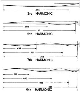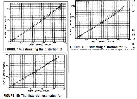 The B+ supply for the earlier part of the amplifier is achieved by putting two resistors in series between the two B+ points and taking the supply from the center point. Ground is provided by the center tap of the output transformer. If the output-tube grids were re turned to ground, the arrangement would be somewhat analogous to a cathode-follower circuit, because the drive at the grids would have to provide the grid swing in addition to the output swing on the cathodes. This is partially offset in the Circlotron circuit by re turning the B+ for the push-pull drive stage to the positive voltage from the opposite output tube in each case. It is difficult to know whether this should be called a positive feedback or a reduction in negative feedback. ![]() FIGURE 14: Estimating the distortion of 5881 tubes as triodes from the transfer characteristic: the peak fundamental is about 158V, while the peak harmonic is about 5.5V; for this the peak ratio represents 3.5% harmonic. FIGURE 15: The distortion estimated for the pentode (tetrode) operation: peak fundamental is 280V, and peak harmonic 8V, for about 2.85% total. FIGURE 16: Estimating distortion for ultralinear operation, from the transfer characteristics: peak fundamental 288V, peak harmonic 11V, and total harmonic distortion, 3.8%. These figures give peak summation in each case, and so differ from the RMS text analysis. ESTIMATING DISTORTION So much for a number of popular varieties of output circuit. One thing more is needed to complete this article: a graphical way to estimate the distortion. This is illustrated in Figs. 14, 15, and 16 for the triode, pentode, and ultralinear operation of the 5881 shown in Figs. 2, 6, and 9 of Part 6a. In each case the transfer characteristic is plotted, plate swing vertically against grid swing horizontally. Only one half of the characteristic is plotted because, being push-pull, the two halves are symmetrical. The negative swing would be exactly similar, but to the left and downward from the zero points. The curve is plotted and then a straight line is drawn from the origin to pass through the curve in such a way that the excursions above and below the straight line (as determined by further dotted lines parallel with it) are equal on both sides. This method of measurement does not determine the relationship between RMS harmonic and RMS fundamental, but between peak harmonic and peak fundamental. If only one harmonic is present, the two figures will, of course, be identical, but invariably more than one harmonic is present. Then the usual trend is that the peak relation ship gives a higher percentage harmonic than the RMS relationship. Although this means that the figure obtained from the construction will not agree with that obtained by the usual forms of measurement, it does mean that it gives a better practical indication of the annoyance value of the distortion, because multiple harmonics-especially high-order ones-are much more annoying than a single lower order harmonic. Figure 17 is given to aid in identifying various harmonics from the third to the ninth, assuming they are present as separate entities. Here the fundamental is represented as being removed and the deviation shown horizontally. Compare Fig. 16 with Fig. 17: the point where the curve crosses the center line should be 0.866 of the total excursion for the harmonic to be pure third. In Fig. 16 the crossover point is a little nearer the top than this, meaning that there are some higher-order harmonics, although quite small in amplitude. On the other hand, the crossover point shown for triode characteristics in Fig. 14 is considerably lower than 0.866, indicating in this case that there are probably components of fifth, seventh, and ninth. The multiple curvature of the transfer characteristic in Fig. 15 can only be explained by the presence of harmonics at least up to the seventh. CONCLUSIONS Now, having studied different kinds of output circuits somewhat, are we in a better position to assess which kind of output--triode, pentode, or ultralinear--is the best one to use? Perhaps it would be more accurate to say that now we can see why there is so much confusion on the issue and why different individuals prefer different circuits. ![]() FIGURE 17: This chart is to aid in identifying the various odd-order harmonics present from the shape of the transfer characteristic. The fractions give the points at which the curve should cross the straight fundamental line, when only that harmonic is present in the signal. From our previous discussion of amplifier design we learned that the circuit should be designed to give the lowest possible distortion before any feed back is applied (and if possible this distortion should be of low order). Com paring the three methods of operation for the 5881: The pentode seemed to show the lowest distortion, but the dominant components were third and seventh. Additionally, the fact that the load line goes across crooked characteristics means that any load deviation from a straight line of specific value will cause considerable variation in the distortion produced. The ultralinear circuit, with 3.3% almost pure third-harmonic distortion, and characteristics whose shape will not cause appreciably increased distortion when the load line deviates from its particular resistance value or goes reactive, is the most practical circuit of the three. The triode-connected arrangement strikes an intermediate position, with 3.3% third- and 1.25% fifth-harmonic distortion. Variation of resistance value over a limited range will not seriously affect the distortion percentage, but re active components are a little more likely to do so. The unity-coupled arrangement achieves a high output from a pentode without the same loss of gain that would be necessary when cathode coupling. Because of the extremely tight coupling between cathode and plate-screen circuits, it is possible to operate this amplifier into the grid-current region