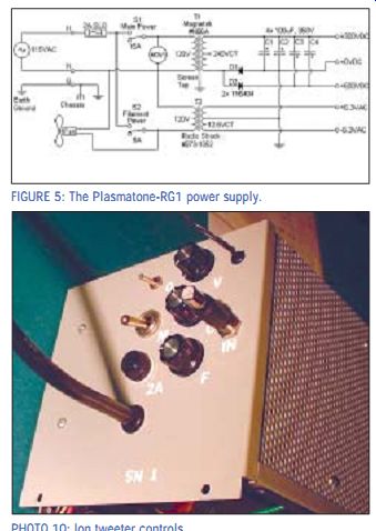 ------------------- WARNING! This project utilizes potentially lethal voltages and should not be attempted by those unfamiliar with high voltages. The corona discharge is produced by volt ages in excess of 20,000V and poses a tremendous heat and fire hazard if exposed to combustible materials. Furthermore, the operation of the corona dis charge is such that it operates in the radio frequency range of 20MHz to 70MHz and is capable of causing radio frequency burns. This unit may emit severe radio frequency interference, so you should use the Faraday shield described in the text to block the RFI and protect the user from coming into contact with the corona discharge flame. ---------------------- ... not currently being used. The power supply is tucked away in the back half of the Hammond case (Photo 9), and the controls are mounted in the rear (Photo 10). Even though the oscillator circuit is astoundingly simple, I suggest building it first on a nice big piece of wood so you can make sure it's working before squeezing it into some small space and integrating it with the audio stages. This will save you a lot of in-circuit troubleshooting time. Beware of unexpected feedback or interference, since you are operating at high frequencies where anything can happen. Make sure you decouple the power supplies to pre vent the strong oscillations from causing more interference and annoying 60Hz hum. CONCLUSIONS This project was a very fun and interesting one for me. Not only does it demonstrate the feasibility of massless audio reproduction and omni-directionality, but also does it in an elegant, al most sci-fi way. I highly encourage the real audiophiles out there to try to bring this idea up to the highest sound quality standards most audiophiles hold. I didn't have the money for expensive audio capacitors, nor did I have the expertise necessary to tweak this project to perfection, but I hope someone out there will! Ultimately, the ion tweeter would operate not just at tweeter frequencies, but also at midrange and maybe even upper woofer frequencies. I would love to see a two-way stereo using a sub woofer and plasma speaker. In fact, I'm soon planning to build an ion speaker using the powerful 813 transmitter tube to try to accomplish this goal. My senior project involved using a field effect transistor as an on/off switch in place of the lossy vacuum tube to increase the power efficiency of the oscillator section. Increasing the power efficiency was the first step in increasing the size of the flame, since it's better not to throw away massive amounts of heat. In theory, it shouldn't matter what kind of device is being used to generate the corona, because the audio character is set by the pre amp stages. RECOMMENDATIONS • Redesign preamp stage for better linearity, dynamic range, and higher gain for compatibility with RCA-level signals. • Use power supply with less DC ripple. • Build a ramp-up circuit for the power supply to prevent large inrush current when turning on the supply. • Try a better RF choke for less power line interference. • Try to build an auto-start for the corona by injecting an impulse of current through the tube. • Try multiple tubes in parallel for a larger flame and wider frequency response. ------- Also see: A HYBRID STEREO $90 CONTROL---With its low cost and simple circuit architecture, this high-quality control unit is one you can easily add to your audio system. |