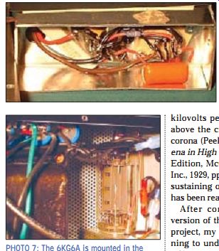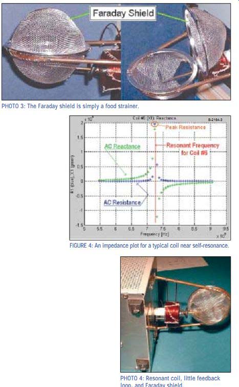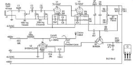 The ion tweeter schematics I used for this project are similar to the first pair I built, with a few modifications, such as the 12AX7 tube preamp stage. The first pair has a lot of problems, so I built a better, more reliable second pair, as presented here. I am presenting the schematics exactly as I have used them, but there are many things I think can be enhanced in the schematics, so I have included a section of recommendations that you should read before at tempting to build this project. ABOUT THE FLAME The corona flame is very peculiar be cause it stands by itself on top of a single electrode, not between two electrodes, like a Jacob's ladder or spark gap transmitter. This feat is quite mind boggling to the typical experimenter who is used to seeing sparks appear be tween two points. In fact, even the resonant coil that is the heart of the project is only connected at one end! The ion flame looks a lot like a candle flame (Photo 2), although it is slightly bluish or white in color. Furthermore, the flame acts like a perfect point source, which means that the acoustical energy is emitted spherically with a perfect uniformity in frequency response. I like the ion flame be cause it operates on the same principle that nature uses to produce sound by lightning and thunder. Unfortunately, the low-frequency extension of the flame is limited by its size. You probably could have guessed that, since thunder can easily reach down to 1Hz or less, requiring millions of watts of electricity in the process, while the spark you get stepping out of your car on a winter day gives you just a little more than a high-pitched snap. For a 1cm flame height (around the same size and shape as a medium candle flame), the frequency response hits -3dB around 2kHz. The upper limit of the frequency response is well above the hearing threshold. It has been measured up to 40kHz, but my guess is that it may extend up into the megahertz. If you were to send bass frequencies to the flame, it would be like sending bass frequencies to a tweeter. It will try to re produce the frequencies, but it won't do it very well! This project draws around 200W of wall power to produce that 1cm flame, so if you were thinking of making an ion subwoofer next, forget it! You would need a lot of power. Subwoofers tend to be non-directional in small rooms any way, so only the higher frequencies re ally need to be addressed. Those of you familiar with spark generation know that where there are sparks, there is the pungent smell of ozone. The corona flame, however, is not a spark, so there is almost no ozone. Since the flame is hot, the ozone that it does produce rises straight above the flame, but there really isn't enough of a smell to cause an annoyance or health hazard. Besides, ozone kills bacteria in the air! The corona flame does generate a lot of heat, and it is a high-voltage hazard, so be very careful when you are working around it. Furthermore, it acts like a little source of a lot of radio frequency interference (RFI). The Federal Communications Commission (FCC) has a lot to say about such things, so I bought a steel mesh food strainer to put around the flame (Photo 3). This grounded shield allows the air-waves to pass through, but prevents electromagnetic waves from propagating. You can see how it works if you pass a small fluorescent tube by the flame without the shield--it will light up 6” from the flame! Incidentally, since the oscillator frequency is very high (around 30MHz), you won't get a shock from the flame, but a radio frequency (RF) burn. Since the flame is so hot, you need to use a copper electrode to sink the heat. I tried a piece of stainless-steel wire once, but it melted! The copper still is slowly "eaten" away by the flame, but there aren't many other options for the electrode material. In the 1960s, they used thoriated tungsten quartz-glass electrodes that retained their sharp ness for up to 1200 hours. CIRCUIT OPERATION Figure 2 shows the schematic I used for the preamp, amp, and oscillator portion of the project. I like to start with the oscillator, because explaining it first helps explain other parts of the system. The heart of the oscillator is what I call the "Tesla" coil. It is not the Tesla coil some of you may be familiar with because it doesn't have a primary and secondary, but it does operate at the self-resonant frequency of the coil. This coil acts similar to a parallel resonant circuit (Fig. 3), where the windings are the inductance component and the interwinding capacitance leads to the capacitive component. The key to producing the high voltages is to have a very high Q-factor for this resonant circuit. ![]() PHOTO 3: The Faraday shield is simply a food strainer. PHOTO 4: Resonant coil, little feedback loop, and Faraday shield. FIGURE 4: An impedance plot for a typical coil near self-resonance. By definition, Q = (2p f0)/bandwidth = (2p f0 L)/R where f0 is the resonant frequency in hertz, L is the inductance in henries, and R is the resistance in ohms. So to get a high Q, the resistive losses need to be small and the inductance large. Since the coil acts like a parallel resonant circuit and the losses will be small, then at the self-resonant frequency of the coil, the coil looks like a near open circuit (Fig. 4). From Ohm's law, if a current is put across a very large resistance, the result is a very high voltage. In his 1956 U.S. patent number 2,768,246, Dr. Klein noted that an audible hiss was present if the oscillator operated at frequencies below around 3MHz, which sets the mini mum acceptable self resonant frequency. Actually, I found that the resonant frequency should be kept above 10MHz to avoid flickering of the flame. The 6KG6A pentode I used for the oscillator has a gain-bandwidth limit of around 70MHz for this design, so I wanted a self-resonant frequency of around 40MHz for the operation. The reason I chose it so high was that a lower resonant frequency would require more inducta