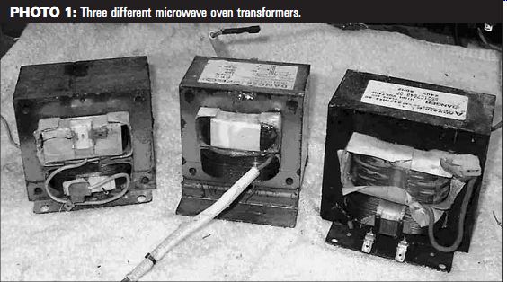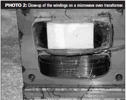 Tube Audio Construction Tips, Part 5: Recycling -------- After a brief respite, this series continues with advice on how to recycle electronic devices for use in amplifiers. By Graham Dicker Microwave ovens are one of my favorite items for recovering parts for both power and out put transformer use. With the core of a microwave oven transformer the turns per volt (TPV) is invariably 1. At 1TPV the sums are simple: for a 110V-300V transformer, all you need is 110 turns on the primary and 300 turns on the secondary, which makes things easy. Most microwave ovens also contain other useful parts, such as high voltage (HV) oil-filled capacitors, which I reuse as a high tension filter capacitor. You can also recycle the high-volt age diodes. RECYCLING WITHOUT REWINDING Photo 1 shows a few of the different transformers available. One of the common properties is that both the primary and secondary windings are fully exposed (Photo 2). The HV secondary has one wire grounded to the core (Photo 3), which you can lift off and connect to a flexible wire. I usually make a few taps on the winding to determine the voltage I need. The nominal secondary voltage of these trans former s i s 2400V RMS.