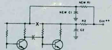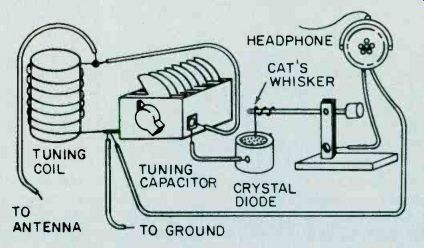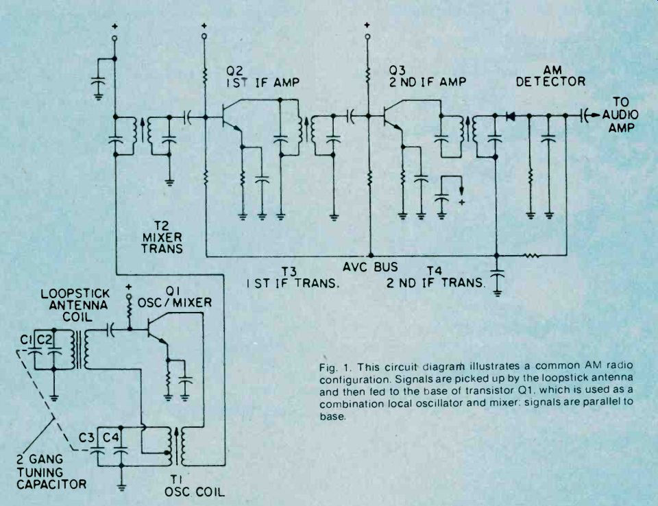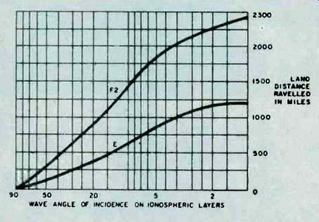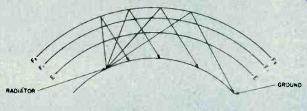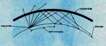 Fig. 6. Adjust the secondary of the discriminator transformer 'til it centers 10.7 MHz. As you progress with the IF alignment, you may find that you can lower the RF output of the signal generator to prevent overload of the receiver. When you are satisfied that all IF transformers are tuned so that no further increase in meter reading can be attained, the IF alignment is complete. The next set of adjustments will align the upper and lower settings of the tuning capacitor. This is accomplished in two steps, which will have to be repeated several times, since the adjustments have some interaction with each other. The initial adjustments are made at the high end of the broadcast band. Set the tuning dial to a silent point (where no radio station is received) near 1600 KHz. Set the RF signal generator to the same frequency. Adjust the two timer capacitor (C2 and C4 in Fig. 1) for maximum meter reading. Then set the tuning dial of the receiver to a silent point around 600 KHz. and set the signal generator to the same frequency. Adjust the oscillator tuning coil (T1 in Fig. 1) for maximum meter reading. Repeat the adjustments for 1600 KHz and 600 KHz as described above until no further improvement can be made. Once you have done this, the AM alignment will be completed. FM Receiver Alignment. Proper FM alignment requires the use of a sweep generator and oscilloscope, unless the receiver under test has a fixed tuned IF section which is permanently aligned at the factory. The generator may be coupled to the antenna terminals of the receiver using the circuit of Fig. 3, which matches the 50-ohm impedance of the generator to the 300-ohm input impedance of the FM receiver. Some receivers may have highly selective front ends which make injection of the 10.7 MHz IF through the RF stages difficult. In these receivers you may couple the output of the signal generator to the input of the first IF amplifier stage through a 10-pf capacitor. This point is shown in Fig. 2, as test point C. Use only sufficient signal strength to achieve a usable display on the oscilloscope. Fig. 4, is a typical connection diagram of the receiver, generator and oscilloscope. The first section of the FM receiver to be aligned is the IF amplifier. Set the signal generator to a center frequency of 10.7 MHz. and a sweep width of about 450 KHz. An FM sweep generator should have a marker system which allows you to identify the important frequencies of interest, such as 10.6, 10.7, and 10.8 MHz. These markers indicate the desired bandwidth of the IF amplifier. Connect the Y input of the oscilloscope to test point A of Fig. 2, and adjust the scope controls to obtain a display similar to Fig. 5. Adjust all IF transformers (T2, T3, & T4 in Fig. 2) so that the amplitude of the display is maximum, while preserving the symmetry of the waveshape at about 10.7 MHz. Bear in mind that low cost FM receivers will have a waveshape similar to that of waveform A, while high quality receivers will have the preferred waveshape B of Fig. 5. The next step is the adjustment of the Ratio Detector or Discriminator. Connect the Y input of the oscilloscope to test point B of Fig. 2, and adjust the secondary of the Ratio Detector or Discriminator transformer (T4 of Fig. 2) to place the 10.7 MHz marker at the center of the S curve, as shown in Fig. 6. Readjust the primary of the same transformer for maximum amplitude and straightness of the line between the positive and negative peaks. This completes the alignment of the IF section of the receiver. Trimmer. Adjustments. The final adjustments to the FM "receiver are made to the trimmer capacitors, which are connected in parallel with the main FM variable capacitors. These are shown in Fig. 2 as C1, C3 and C5. Note that some FM receivers, especially the higher quality ones, may have four such trimmer capacitors. These adjustments are made with the FM tuning dial set to near the high end of the range, (108 MHz). Set the FM dial to a silent point near 108 MHz. Set the signal generator to the same frequency as the dial setting, and couple the output of the generator to the antenna terminals of the receiver as shown in Fig. 3. Connect a DC voltmeter to test point A as shown in Fig. 2, and use only enough signal output from the generator to attain a reliable meter reading. Adjust C1, C3, and C5 as shown in Fig. 2, for maximum meter reading. As a final check, set the receiver dial to a silent point, near the low end of the range, 88 MHz, and set the generator frequency to the same frequency. Now, by varying the generator about 88 MHz while watching the DC voltmeter, you can determine how accurate the FM dial is. Keep in mind that if you do make this adjustment you will have to go back to 108 MHz and readjust the trimmer capacitors again. In addition, if you are working on an AM/FM receiver slipping the dial pointer will also require a realignment of the RF section of the AM receiver. For. these reasons it is not recommended that the dial be slipped unless it already has been placed far out of calibration through some previous servicing procedure. ======== ======== Signal PropagationThe propagation of all radio waves may be defined as: "The traveling of wave energy through the atmosphere." How do signals get from one side of the world to the other? The ionosphere, a region of the earth's atmosphere extending upwards from 50 to 350 miles (80-560 kilometers), has ionized layers with the ability to reflect electromagnetic energy of certain frequencies. The purpose of this article is to review, briefly, the components of the ionosphere, some propagation characteristics, and some ways that you can tell whether or not the amateur bands are in good condition for DX communications. ![]() Fig. 1. The diagram above shows the effects of interaction between three layers on the reflection of radio waves back to Earth receivers. ![]() Fig. 2. This diagram demonstrates the principle of skip. You can see effects of ionospheric refle