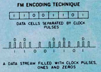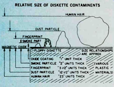 How Floppy Disk Systems Work Sooner or later just about every serious computer hobbyist reaches their computer's memory limit. There are some applications that require too much I/O action to be practical with a cassette based system or require too much memory space to fit in a RAM. It's this need for high-volume storage and rapid access time that makes a hobbyist disk system desirable. These systems don't come close to commercial hard disk systems in terms of performance but they can easily fill the computer hobbyist's memory bill. ![]() ----------- RELATIVE SIZE OF DISKETTE CONTAMINENTS---The metal oxide surface of a floppy disk is very sensitive to contamination. Each one of these contaminants (right) could cause a dropped bit. Since the disk is always kept in it's protective envelope, this is usually not too much of a problem in daily usage. Floppies have become the missing link to a midrange of random access memory systems. The floppy offers higher performance at lower cost than cassette and similar types of Input/Output (I/O) devices. Well Packaged. The present standard floppy is an 8-inch flexible disk of a plastic material coated with a magnetic oxide. Looking a little like a popular 45 RPM record, it is sealed inside a jacket and there are no grooves on the surface. The disk cannot be removed from the jacket which is designed to protect the recording surface. The disk is visible at a slot, a spot, and a hole in the center of the jacket. Users are told by the instructions that we must not touch exposed areas of the disk or write on it with anything firmer than a Q tip. Finally the user is admonished to return the jacketed disk to its outer envelope after they have finished using it. The natural skin oil of fingerprints can damage the quality of music in needle and groove recordings, and in the super-miniature world of floppies, a fingerprint can destroy an entire segment of data. A dust particle can waste a dozen sectors and a human hair can reduce the effectiveness of the Read/Write/Erase (R/W/E) heads. It is understandable why the media, as the flexible disk is sometimes called, is permanently sealed with all of those implicit instructions. There is, however, an internal jacket wiper that continually cleans the rotating disk and removes contaminants, and floppies are reasonably rugged. Hardware. The disk-drive hardware is add-on equipment to the main frame of the computer. Inside the drive are motors, driving mechanisms, and interfacing electronics that enable the drive unit to "talk" with the controller. The diskette is inserted into the drive unit through a small door in the front. Once the door is shut, it is locked by the drive unit logic until the door release button is pushed to disable the drive assembly. The drive spindle centers and grasps the center of the diskette firmly as the motor comes up to speed. During power-up the diskette reaches a speed of 360 RPM, and R/W/E heads are stepped out to track 00 and a mechanical index hole provides the first location pulse for disk timing. In the IBM format this is the only reference to a physical location on the disk. The floppy is firmly held against the recording surface, and the heads are positioned by a precise stepping motor. While the heads are positioned over the desired track, they ride above the spinning diskette. Once the correct track is located, in what is called a "seek operation," a head loading coil pulls the heads down onto the magnetic surface. This operation is called loading the heads and it is controlled by a computer program. When the heads are to be moved again, in another seek operation, to a new track, they are first unloaded, stepped to a new track, and then reloaded to a new track. This requires about three milliseconds per track of movement. It will further require about 50 milliseconds, per track, to move the heads and about 15 milliseconds of settling time. Part of System. Floppies should always be thought of as a part of a sophisticated cluster of mechanical drivers, computer electronics, and software called a computer. Fundamentally this computer consists of a central processor unit (CPU), some memory, some interfacing devices, called controllers here, and an entry device such as a keyboard CRT, and some software. Computer operation is made possible by a written program entered into the computer's memory and operated on by the internal microprocessor. The programs are fed by any one of a number of techniques: a paper tape punch, keyboard, cassette tape, or teletype. All of these are slow and time consuming. New ways are continually being introduced to feed the voracious appetite of computer memories. Floppies are the most versatile of the program instruction loading techniques In a computer's time frame things go on a million times faster than in our brain's time frame. In such a whirlwind existence, telling computers what to do was a difficult problem. The answer was in the development of software which the computer could store in memory for reference each time it needed a new program instruction. ![]() --------- READ/WRITE/ERASE OPERATION--There is no physical track on the disk as with an LP record. The tracks are formed by the passage of the record (write) head over the surface of the disk. The disk itself appears to be a solid sheet of recording tape material. Software. The computer-the IC's, printed circuit boards, filter capacitors, chassis, and power supply-are all part of the hardware. All of this state-of-the-art electronics is just so much junk without a program, a way to make the computer compute. The instructions, written in computer languages, are called software. We talk with the floppy (human to floppy) through a series of interpreters comprised of software and hardware. First we place our instructions, using perhaps, Fortran in a machine assembly language. Located within this language and acting as a general interpreter, is a section of software called a file manager. Its job is to