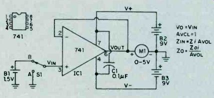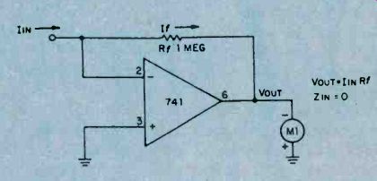 The resulting closed-loop gain, or AvcL, is unity (one unit out for one unit in). However, the high AvoL inside the IC itself is still present, enforcing close compliance with the several rules. As noted on Fig. 2, actual input and output resistances ZIN and Zo are much improved due to feedback. The resultant input resistance now equals Zi times AVOL or400,000 megohms for the741 op amp! The resultant output resistance now equals Zoi divided by AVOL, or .0035 ohms! Consequently, the unity gain follower can duplicate the input voltage at its output without loading down the input voltage source due to the high input resistance and with high accuracy due to the low output resistance. Actually, input and output resistances are degraded somewhat by secondary factors. Nevertheless, this unity gain follower offers the highest input resistance and lowest output resistance of the several basic circuits. Non-Inverting Voltage Amplifier. Stable op amp voltage amplification is obtained by feeding back only a portion of the output voltage. Alter your breadboard circuit to include feedback voltage divider resistors Rf and Rr, as shown in Fig. 3. With Rf equal to 2Rr,,only one-third of the output voltage is fed back to the inverting input. 1 With Si at position A, the + input is at ground voltage and the meter indicates zero. By rule 3, the ‘-‘ input is at virtual ground or zero. With zero voltage across Rr, current Ir is zero. In view of rule 2, If always equals Ir and is zero in this case. With zero current in Rf, the ‘-‘ input and the output voltage must be equal and zero in this instance. ![]() Fig. 4. The circuit arrangement of the op amp provides an inverting output with a gain of 3. Compare it to fig. 3. With S1 at position B, the + input is raised 1.5 volts and the meter indicates 4.5 volts. By rule 4, the ‘-’ input must rise to 1.5 volts matching that at the + input. The op amp does this by forcing a current into the feedback voltage divider as shown. With 1.5 volts across Rr, current Ir equals 1.5 volts divided by 1500 ohms, or 1 mA. Also, the voltage across Rf equals 1 mA times 3000 ohms or 3 volts. Thus, VOUT equals 1.5 plus 3 or 4.5 volts. Closed-loop voltage gain AVCL equals 1 + (Rf/Rr) or 3 in this case. Compared with the unity gain circuit, actual output resistance Zo is three times grater and input resistance ZIN is one third that of the unity gain circuit. This reflects the effect of feeding back 1/3 of the output voltage. To obtain a closed-loop gain of ten, resistor Rf must equal 9Rr, and so forth. Inverting Voltage Amplifier. Alter the breadboard circuit to that of Fig. 4 including reversal of the meter. With S1 at position A, the meter indicates zero. The proof of this result is identical to that of the non-inverting voltage amplifier with switch at position A. With S1 at position B, the meter indicates 3 volts (actually, minus 3 volts since the meter is now reversed). In this case, the ‘-’ input does not rise to 1.5 volts. By rule 3, with + input grounded, the ‘-’ input must remain at virtual ground. Therefore, and quite importantly, the voltage across Rr equals the input voltage, or 1.5 volts divided by 1500 ohms, or 1 mA, flowing in the direction shown. Since If equals 1 mA times 3000 ohms, or 3 volts. With the ‘-’ input at virtual ground, the output voltage must be minus 3 volts as indicated on the reversed meter. The closed loop voltage again, AVCL, is simply Rf/Rr, or 2 in this case. Quite unlike the previous cases, actual input resistance ZIN equals Rr, the input resistor. Compared with the unity gain non-inverting amplifier, actual output resistance Zo is greater by a factor of (1 + AvcL) or three times as much, still acceptable small at this (and even much higher) gain. By connecting additional input resistors to the ‘-’ input and upon applying several input voltages, the amplifier will sum the several input voltages at the output. For this reason, the amplifier is often termed a summing amplifier and the ‘-’ input is termed the summing node or input. ![]() Fig. 5. Using only one external circuit element, this op amp functions as a current-to-voltage converter. Current to Voltage Converter. A variation of the inverting amplifier, the current to voltage converter shown in Fig. 5, omits input resistor Rr. Because the ‘-’ input must remain at virtual ground for linear operation, this circuit cannot accept an input voltage. Instead, it accepts an input current and is used to measure very small currents. If IIN were 1 micro A, the output voltage would be 1 micro A times 1 megohm, or 1 volt. By making Rf very large, the circuit can measure extremely small currents. The input resistance of this circuit is zero. The output voltage, VOUT, equals IIN times Rf. If you breadboard this circuit, you may observe a small output voltage at zero input current. This output "offset" voltage is caused by the flow of a small bias current from output to input through the large feedback resistor, Rf. Unless special opamps having very low bias currents are used, it is necessary to include a nulling circuit to reset. Input Bias and Offset. Although rule 2 assumed zero input currents, an op amp does require a small input current Ib to bias the input stage into linear operation. For the 741, Ib may range up to 0.5 uA. The difference between the input bias currents at the two inputs is the input offest bias current ziio. This current is usually much smaller than Ib. Both Ib and Iio cause an objectionable output offset voltage with Rf is very large. To restore the output voltage to zero, add the nulling circuit potentiometer R1 and resistor R2 as shown in Fig. 6. With Si open, adjust the control until meter indicates zero. If Rr is small, and upon closing S1, you may observe that the meter again loses its zero. This is caused by the input offset voltage Vio resulting from slight mismatches of the input transistors. Input offset voltage Vio is defined as that input vo