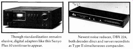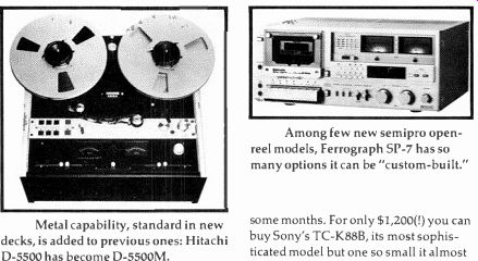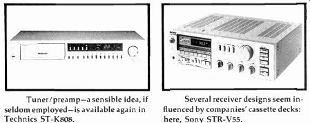 --------------- ![]() Power metering, now common place, is supplemented by spectrum display in Optonica SX-9305 power amp. New circuitry appears in integrated as well as separate amps; this is Lux L-480 Duo-Beta model. ---------------------- Once again, preamps are the object of much technical refinement and innovation. For several years, Harman Kardon has been promising that its association with Finnish audio engineer Matti Otala would result in some important new products. Its first Otala-inspired design is the Model 725 preamp ($270), in which it claims to have cut negative feedback (one factor associated with dynamic intermodulation phenomena, originally identified by Otala) by some 30 dB. Harman Kardon has opted not to use integrated circuits in its construction, claiming that they were made unacceptable by discrete components' higher resistance to thermal distortion. Lux, too, addresses the issue of negative feedback in its two new preamps, the C-500A and the C-120A. Priced at $1,400 and $445, respectively, they employ Lux's Duo-fl circuitry, which limits the negative feedback over most of the band and employs separate DC/infrasonic feedback. Maintaining correct RIAA equalization without compromising cartridge loading is one of the claims for Hegeman Audio Products' Model Hapi 2 preamp ($900), which relies on passive equalization. So does the $325 Sirius preamp from Dennesen Electrostatic, which now has a full line of electronics. A company that we reported on back in September 1979, JSH Laboratories, has been re formed under the name MTI, Inc. Its Model 500 is an all-Class A design said to provide enough output to allow use of the line amp section as a separate power amp independent of the preamp functions; it will supply up to 50 watts per channel into an 8-ohm load. Also ship ping their first preamps are Tandberg, with the $1,000 Model TCA-3002, and ADC, whose tube model was demonstrated in prototype last year. Audionics of Oregon incorporates a unique device into its RS-1 Class A preamp ($1,200): An AXIAL TILT knob makes electronic corrections for up to seven degrees of vertical misalignment of the phono pickup to improve stereo imaging. One of the most flexible preamps offered comes from Soundcraftsmen in the SP-4001, which com bines a 10-band dual-channel graphic equalizer with full preamp circuitry ($550). Finally, kit builders will appreciate the appearance of Audible Illusions. A spokesman told us that the new West Coast company plans to fill the void left when Dynaco stopped manufacturing high-quality tube amplifier kits. First offerings from Audible Illusions include a low-priced three-tube preamp, the Mini Mite I, the more sophisticated Dual Mono, and a solid-state model, the M-1. In amplifiers, integrated and otherwise, the emphasis appears to be on moderate power output combined with subtle circuit refinements. Akai's three integrated amps range in output from 37 watts (15 3/4 dBW) to 68 watts (18% dBW) per channel. The top-of-the-line Model AM-U06 ($350) features a pulsed power supply, three-step loudness contouring, and an independent recording-output defeat to prevent interference from unused decks. ReVox' integrated amp, the B-750 Mk. II ($1,000), has a rated out put of 75 watts (183/4 dBW) per channel with 1 dB of dynamic headroom. Lux has incorporated its Duo-,Blow-negative-feedback circuitry into its three integrateds, the L-580, L-480, and L-450. Kenwood has put a lot of thought and engineering expertise into its L-01A integrated amplifier ($1,500). Having determined that conventional amplifiers built on chassis formed of magnetic materials exhibit magnetically generated harmonic distortion, the company constructed this 100-watt model of non magnetic materials and separate from its power-supply module. Somewhat more conventional in construction is the Kenwood KA-500 integrated amp, rated at 43 watts (16% dBW). With the KT-500 tuner and RC-500 remote control, it constitutes a full remote-controlled system. Marantz' three new integrated amps range in power output from 38 watts (15 3/4 dBW) to 87 watts (19% dBW). The top-of-the-line PM-700 is packed with features, including a dual-channel, 5-band graphic equalizer and a Freon cooling system. Prices for the Marantz amps range from $225 to $420. Toshiba's entry is the SB-445 ($260), an integrated amp with a 45-watt (161/2 dBW) output. And Qysonic, now a division of-guess what!-Motown, has entered the electronics market with its M-1 integrated model. Rated at 85 watts per channel (19 1/4 dBW), the Qysonic is a high-speed, Class A design. Gone are the days of power amps with enough output to run a washing machine, it would seem, though some pretty hefty models continue to appear. An English company, Esoteric Audio Research, has a 500-watt (27 dBW) mono tube amp for $2,650. It also has one with an output of 100 watts (20 dBW) and a price tag of (just) $1,000. Another unusual entry is from Spectron Electronics in California, whose Class D switching amp is said to pump out 500 watts (27 dBW) per channel from its 18-pound chassis. And Infinity, which was the first to introduce a Class D amp some years back, is now offering a hybrid Class A power amp. The Model HCA ($4,000) employs tubes in the input stage and high-speed transistors in the output stage for a rated power output of 150 watts (21% dBW) per channel. SAE's three power amps range in output from 100 watts (20 dBW) to 250 watts (24 dBW) and in price from $550 to $1,000. Dubbed the SAE 01 Series, each of these amps combines two amplifiers per channel-one to handle the positive slope of a musical waveform and the other the negative slope. SAE claims that this design handles complex speaker loads-even 2-ohm loads-more easily than conventional amps. Harman Kardon's approach to low negative feedback is reflected in its Model 770 amp ($400). Though its output is a moderate 65 watts (18 dBW), the 770 employs separate toroidal power supplies for each channel. Two new Amp