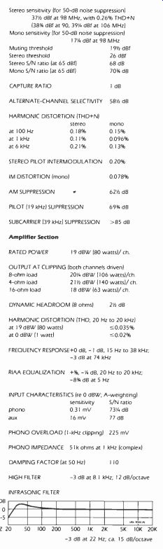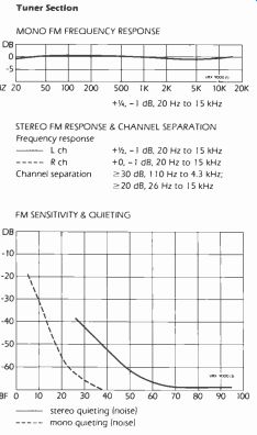 Preparation supervised by Robert Long, Peter Dobbin, and Edward J. Foster. Laboratory data (unless otherwise noted) supplied by CBS Technology Center or Diversified Science Laboratories. ----------------------- ![]() Vector Aims at U.S. Vector Research Model VRX-9000 Tuner Section ![]() ![]() ![]() Vector Research Model VRX-9000 AM/FM receiver in metal case. Dimensions: 17 1/4 by 5 3/8 inches (front), 13 3/8 inches deep plus clearance for connections. Convenience outlets: one switched (100 watts), one unswitched (200 watts). Price: $750; optional VKD-1 wood case, $25; optional VMA rack handles, $35; optional VRC-1 wired remote control, $75. Warranty: "limited," two years parts and labor. Manufacturer: made in Japan for Vector Research, Inc., 20600 Nordhoff St., Chatsworth, Calif. 91311. Vector Research, a new American-based company with manufacturing facilities in Japan, is doing what some foreign-based companies find difficult: providing the U.S. market with sophisticated audio products that have carefully judged features at attractive price points. Its first offerings are three cassette decks and three receivers, of which the VRX-9000 is the flagship. Though the purchase of separate audio electronics (tuner, preamp, and power amp) can still be justified by specific user needs, increased flexibility, and, sometimes, better performance, the VRX-9000 goes a long way toward blurring the distinctions between separates and receivers. One would have to spend a great deal more for separates with the features in this relatively compact receiver. The array of tiny buttons may give one pause, but a moment or two of examination reveals their neatly logical planning. Frequency-synthesized tuning is accomplished in discrete manual steps (0.1 MHz on FM, 1 kHz on AM) via the separate UP and DOWN buttons. To activate the automatic station scanning function, you simply depress HOLD SCAN and either UP or DOWN. With FM MUTE engaged, stations with a signal strength of at least 26 dBf in stereo or 19 dBf in mono (for quieting levels of 38 1/2 and 53 1/4 dB, respectively) lock in and hold for several seconds. This can be a bit tedious in areas where there are many weak stations, because the stereo threshold is not adjustable and the circuit holds stations that, to our ears, are more noise than music. But once you receive a clear broadcast, you can enter it for retrieval by depressing STORE and any one of the six numbered presets. An LED above STORE illuminates for a few seconds, indicating the memory's willingness to cooperate; if you do not press a preset within a few seconds, it quietly blinks out. The owner's manual says that the memory circuits will retain presets for up to twenty-four hours even with external power disconnected but advises that two AA cells be loaded into the compartment on the rear of the unit for memory retention of up to one year. Data from Diversified Science Labs prove the tuner section capable of very good overall performance. Frequency readout is almost dead-on accurate, showing a deviation of just 0.01 MHz at each of our FM test frequencies. Sensitivity is quite high, which leads us to question the usefulness of the five-segment LED signal-strength indicator. Like most of these devices, it is of little help for antenna orientation or for finding extremely weak stations; the most sensitive of the LEDs responds to a minimum signal of 25 dBf, which is almost exactly the stereo muting threshold and well above the minimum for useful mono reception. The preamp section tests out quite nicely, too. RIAA equalization is accurate, particularly so for a receiver. Outstanding, in our opinion, is the flexibility in loudness contouring, which has its own adjustment knob and thus can be matched to any speaker efficiency. The lab's graphs show that the LOUDNESS control lowers levels throughout and beyond the midrange, thereby raising the relative level of the deep bass and, to some extent, the extreme treble. As you turn the knob clockwise, the absolute level diminishes somewhat. This may seem confusing at first, since volume controls work in the opposite direction; once you realize that its purpose is to increase the degree of compensation, all becomes clear. We could not wish for a more effective and gentle compensation scheme. The bass and treble controls are fairly standard in their operation. So is that for the midrange; its boost/cut action is less extreme than that for the other two, as it should be. The lab discovered, however, that the TONE DEFEAT is not absolute: Some interaction remains if the bass has been left at its maximum setting. Tests of the power amp section indicate the kind of real-world design that is inherent in the VRX-9000. Clipping of continuous tones does not occur until output is 20 1/4 dBW (106 watts)-a full 1 1/4 dBW above its 80-watt rating, and an additional 1 1/4 dB of output in the pulse test, for the equivalent of 140 watts on musical peaks. Low-frequency damping factor is extremely generous, and total harmonic distortion figures come in far below the rated 0.08% across the audible band at both 0 dBW and rated output. As we've said many times before, power meters on amplifiers or receivers are more cosmetic than useful, and those on the VRX-9000 confirm our contention. Though reasonably accurate at both the low and high scales, the ballistics are quite slow in responding to pulses, thereby obviating their use as clipping-level indicators. As an alternative to separates, a receiver with such sophisticated performance and functions demands attention. The phono section and amplifier impressed us with their effortless reproduction. And, though we would have preferred an adjustable muting threshold, or at least a fast-scan mode in the tuner, it performed flawlessly-never losing its quartz-lock grip on a selected station. This is one of those receivers that seem to ask for eye-level placement; with so many buttons arranged along a matte black background and marked i