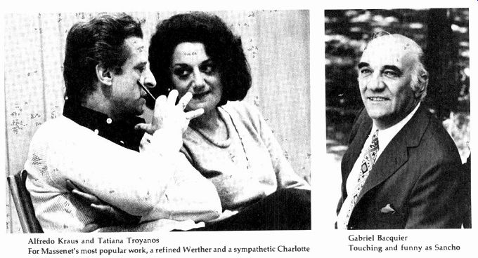 As in most French opera recordings these days, the cast is international, but Werther, more than most Massenet operas, has responded to foreign singers ever since its Viennese premiere in 1892. Here the Spanish tenor Alfredo Kraus re-creates his interpretation of the title role, one he has sung in almost every major operatic center. Now in his fifties, Kraus has lost little vocal quality, and he sings with his customary taste, refinement, and care for integrating musical and dramatic values. His timbre may strike some as a bit too dry and his approach a trifle over-restrained, but his grasp of the style, the focused poise of his singing, and the dignity of his overall conception combine to make him today's preferred Werther. Tatiana Troyanos' burnished mezzo-soprano is a gorgeous natural instrument, and she is a sympathetic Charlotte. While doing nothing especially out of the ordinary with the role, she still captures attention simply through the innate quality of her voice. Matteo Manuguerra makes a more positive figure out of Albert than most, while Christiane Barbaux as Sophie and Jules Bastin as the Bailiff leave little room for improvement. Angel's wide-ranging reproduction and luxuriously cushioned sonics suit the score perfectly. DG's performance need not detain us long-here is a case where ecumenical musical forces fail to convince. The young Italian conductor Riccardo Chailly makes his recording debut with a brisk, sensible reading that has many solid virtues. He gets expressive, committed, and alert playing out of the Cologne Radio Orchestra, al though there is little of the felicitous attention to detail that distinguishes Plasson's conducting for Angel. Placido Domingo is in fine voice, and his extrovert Werther scores points for broad tenor abandon if not for delicacy or finesse. Elena Obraztsoya, on the other hand, is all wrong as Charlotte; her vibrato-laden mezzo, coarse phrasing, and weird French pronunciation turn the character into something quite repulsive. Arleen Auger's overly mature Sophie and the German singers in the cast sound distinctly out of their element. Moving on to pleasanter things, Lon don's Don Quichotte can be warmly recommended as a more than serviceable performance of an instantly lovable opera. Laid out in five compact acts, this treatment of Cervantes' novel depicts most of the familiar high points: the Don's wooing of Dulcinee, his battle with the windmills and confrontation with the bandits in an effort to retrieve his beloved lady's necklace, his gentle rejection by Dulcinee and lonely death with only the faithful Sancho Panza to mourn his passing. This is late Massenet, composed in 1910 for the great Russian bass Feodor Chaliapin, and the composer's last unequivocal success. Perhaps he projected something of himself into the character of the aging Don Quichotte-certainly both men pined for beautiful young creatures and were destined to see their passions un requited. Massenet's affection for the Don is everywhere apparent, in the limpidly ac companied serenade to Dulcinee, his valor in the face of danger, his courtly dignity, the pathos of the death scene. The Don is the final great figure in the composer's gallery of singing/acting roles, a mellow portrait painted in delicate tints and with a depth of human perception unusual for Massenet. Nor is Dulcinee neglected, a more complex figure than in Cervantes and a fun-loving, high-spirited girl capable of tenderness and passion. Sancho, too, is sharply delineated within a conventional but effective buffo tradition, and the colorful atmosphere of the Spanish setting is suggested by infectious dance rhythms and ornamental flicks, proving that Massenet's gift for piquant musical pastiche had lost none of its power to charm even at the end of his composing career. If Nicolai Ghiaurov's interpretation of the title role does not overwhelm with any special insights, let alone efface memo ries of the recordings of Chaliapin or Vanni-Marcoux, the Bulgarian limns a sympathetic character, and for the most part, he sings splendidly. Regine Crespin may be a bit past the point where she can toss off Dulcinee's more florid passages with complete ease and security, but how consummately she can turn a lyrical phrase and find meaning in the simplest line of text-here is a great artist at work, vocal flaws and all. Gabriel Bacquier is his own capital self, portraying a humorous yet warmly touching Sancho Panza, and Kazimierz Kord conducts the Suisse Ro mande with panache and sensibility. London's plush engineering is very much to the point, although spreading this short opera over six sides seems rather uneconomical. No matter. This is an infinitely superior ac count of the score as compared to the spotty, long-deleted Everest version from Belgrade. Like Werther and Don Quichotte, Sapho is based on a novel, Alphonse Daudet's description of Bohemian artist life in Paris at the turn of the century. The plot ingredients are familiar enough: A slightly passee artist's model, Fanny Legrand, falls in love with an innocent young country swain named Jean, who is ignorant of her sordid past. When the facts eventually come out, there are quarrels and reconciliations until Fanny realizes that a shared life for people of such disparate backgrounds is impossible, and she leaves Jean for good. Echoes of Verdi's La Traviata and presentiments of Puccini's La Rondine are obvious in this oft-used material, but Massenet has a way of making it all sound fresh. Sapho is unique in the Massenet canon in that it depicts contemporary society, a verismo type of opera very fashionable in 1897. (Charpentier's Louise, which came three years later, is the most notable example of the "musical novel" genre.) He makes a virtue of this and takes care to provide a musical background redo lent of the period. The brief opening act, for example, shows Fanny and Jean meeting at a party in the studio of the sculptor Caoudal, who had used Fanny as, among