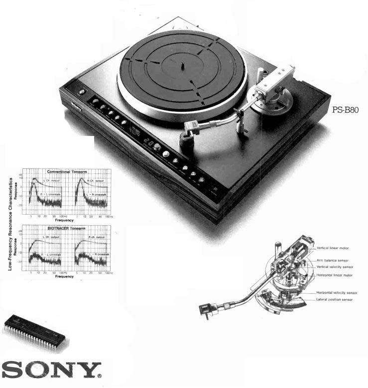 Is it possible to love a fatter tonearm? Most sleek, graceful tonearms, including Sony's, are lovingly crafted precision instruments. But even the most expensive beauties have a beast of a problem. Tonearm resonance. At low frequencies, feedback in the form of noise and wayward harmonics is added to your music. Bach with a tiny tuba in the background. It's called the last big turntable problem. Poof. Sony banished tonearm resonance at any frequency by putting a linear motor in the tonearm. And a linear motor under the tonearm. That's why it's radically fatter and radically better. It's totally electronic. We call our new tonearm the Biotracer and our new turntable is the PS-B80. It's the highest-fi you can buy for professional applications or critical home listening. ![]() ---------- Frequency A microcomputer orchestrates every tonearm move. There are no counterweights, tracking force mechanisms or antiskating devices. When the PS-B80 is first turned on, or when a new cartridge is installed, the microcomputer automatically adjusts the arm for zero balance. A standby lamp on the arm base illuminates during this brief operation. You select the stylus force by dialing an LED readout on the front panel and the microcomputer automatically makes the adjustment. Tracking force can be changed during record play. Antiskating force is automatically and continuously applied by the horizontal linear motor. A sensor relays the tonearm's lateral position to the microcomputer the selected tracking force is stored in its memory. The linear torque BSL (Brushless & Slotless) turntable motor delivers an extremely high signal-to-noise ratio and virtually eliminates wow and flutter. The BSL motor in a major design breakthrough has no slots to cause uneven torque distribution. A highly stable quartz-crystal oscillator and a magnedisc servo-controlled system lock turntable speed for precise platter rotation. Consider the electronic automation. Record play is automatic. Record size selection is automatic. Repeat and partial repeat are automatic. Even stylus cleaning is automatic. The new all-electronic Sony PS-B80 redefines the limits of turn table technology. Listen closely. You're going to love it. PS-B80 --------- Vertical linear motor Arm balance sensor Vertical velocity sensor Horizontal linear motor Horizontal velocity sensor Lateral position sensor --------------- SONY ----------------- (High Fidelity, Apr 1980) Also see: ADC Integra Series carbon-fibre integrated headshell/cartridge Predictable Crises in Classical Music Recording, by Allan Kozinn