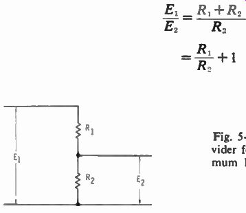 Diodes in r-f voltmeters are limited as to the voltage they can handle, and this limit must be observed. On solid-state diodes the limit on most is about 20 volts. A resistor voltage divider must be used externally for reading higher voltages. VTVM's with vacuum tube diodes are usually good for reading voltages up to about 500 volts without damage to the diode. In the voltage divider circuit of Fig. 5-4, the voltage out is related to the voltage in by the value of R2 to the sum of R1 and R2 . This ratio can be simplified as follows: