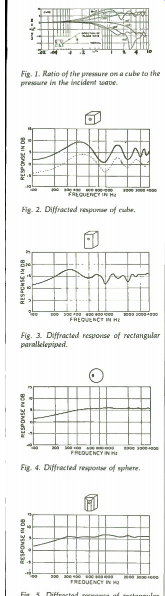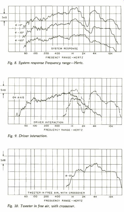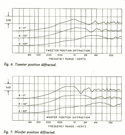 Fig. 8. System response Frequency range-Hertz. Fig. 9. Driver interaction. Fig. 10. Tweeter in free air, with crossover. WHAT DOES IT ALL MEAN? In home hi-fi speaker systems diffraction works in mysterious ways. Although the front baffle edges are the main diffracting surfaces, other less obvious factors may cause the effects of diffraction to snowball. For instance, the edges may be responsible for 5 or 10 dB aberrations. If a driver is not mounted flush with the front baffle, diffraction might add or subtract up to 5dB to or from the system's frequency response. If a molding extends beyond the front baffle surface to serve as a grille frame, another 5dB may be add ed or subtracted. And if we do not give meticulous care to diffraction's role in the crossover region we might incur still other anomalies, perhaps 5dB or so in magnitude. The end result could be a giant 25dB response variation; or diffraction might impart only a gentle five decibel boost at certain frequencies. That depends on how many drivers we use in the system, their bandwidths as limited by the crossover network, their radiation 90 degrees off-axis, and the size and shape of the enclosure. If these qualifications seem overwhelming, all we need to quell diffraction is to flush mount each driver on the front baffle so it is not equidistant from any two edges, and to eliminate all protrusions and abrupt discontinuities from the cabinet's front. If we take these two steps we need worry no further. THE REAL WORLD Right now you're probably saying, "Big deal. All these measurements have been made in an anechoic chamber. So what's diffraction doing in my living room?" Aha! Good question. Basically, you can forget about diffraction in your living room. I'll give you a few good reasons. First of all, measuring a loudspeaker's frequency response on axis in an anechoic chamber gives no indication of how the speaker will per form in a room. Frequency response measurements taken in a reverberation chamber give a more accurate indication of its performance. Such a room reflects all the sound produced inside it--unlike an anechoic room, which absorbs all the sound. Hence, instead of measuring a system's response at one isolated, position relative to it's axis, the reverberation chamber averages out the system's response in all directions. Now, since diffraction will occur only at those frequencies at which a driver is omnidirectional, and since its effects will be apparent only in a narrow area in front of the speaker, the diffracted waves represent only a small portion of the total sound produced by the speaker, even if they seem substantial in on-axis anechoic measurements. Hence, the effects of diffraction will not be apparent in a reverberation chamber, nor will they be apparent in a normally reflective listening environment--especially when one considers that most serious stereo listening is done well off-axis, where the effects of diffraction have all but disappeared. Also, sound waves inside a room are reflected and diffracted over and over again. Although the enclosure's front baffle may have been the main diffracting surface in the anechoic chamber, its role in a reflective listening environment could be radically different. In fact, more deleterious diffraction might occur around the bookshelf than around the bookshelf speakers. SORTING IT OUT You can see why manufacturers have metaphorically thumbed their corporate noses at diffraction: they feel rectifying the problem would not be "cost effective." Perhaps they are right. A viable solution would necessitate construction of Olson's "rectangular truncated pyramid and parallelepiped combination." This enclosure is more difficult and therefore more expensive to fabricate than a standard rectangular box, yet it can yield no readily audible improvement. Most people don't know what diffraction is anyway, and they don't care. Perhaps this is as it should be. We may regard diffraction as kin to magnet weight and gap flux density: of consequence only insofar as it affects a readily measurable performance parameter. Even then it's the black sheep of the family, since its effects vary with the loudspeaker's environment. On the other hand, such a generalized philosophy may spawn other problems because of its inherent inflexibility. Imagine an engineer who does not recognize diffraction's existence, and who adjusts crossover networks in an anechoic chamber. He will incorrectly attribute the effects of diffraction to the drivers themselves. If he compounds the problem by adjusting the crossovers for maximum smoothness on-axis in the anechoic chamber, the system's frequency response in an average listening room will be anything but smooth. And what about the poor soul whose speakers are adversely affected by dif fraction in his listening room? After all, such a situation is possible. The poor chap would have to listen to his speakers nearly on-axis, either out doors, where the environment is anechoic or in a room that absorbs most of the smooth off-axis response at the frequencies at which diffraction occurs. I can't think of a better example of this than a recording engineer in his studio. Yet I can't recall seeing a studio monitor that hasn't a rectangular, acoustically impossible cabinet. And what about the audiophile who's just spent hundreds of dollars on a pair of 12 cubic foot monsters? Cost effectiveness can no longer be used as a valid excuse for designing an enclosure that defies common acoustic sense. TO THE HOBBYIST If you like to roll your own, the easiest way to deal with diffraction is to talk softly and follow the two Golden Rules mentioned earlier. Just adjust the dimensions of Olson's enclosure* to yield the interior volume you desire. *"A rectangular truncated pyramid is mounted upon a rectangular parallelepiped. The lengths of the edges of the rectangular parallelepiped are 1, 2, and 3 feet. The lengths of the edges of the truncated surface are 1 foot and 2*/2 feet. The