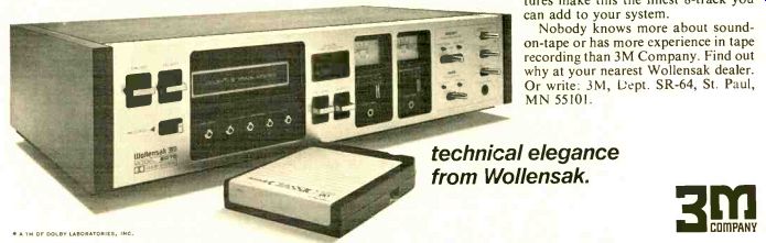 The Only Headphone with Full 4-Channel Separation At long last, there's a quadraphonic headphone that really works: TELEPHONICS TEL-10ff. Based on a technological breakthrough (the "Fixler Effect") the TEL-101F Headphone provides the ambience, separation and realism That only true quadraphonic sound can give. And no other headphone on the market uses the "Fixler Effect!' It's, a Telephonics' exclusive. Modern Hi-Fi and Stereo Guide said, "The new phones put the sound outside your head in a 360 degree circle, just as loudspeakers do!' In Popular Mechanics Robert Angus said, "Fixler Headphones- the only one we've found that really reproduces the 4-Channel speaker experience ... the sensation was exactly that of listening to a good four channel speaker array!' Angus also said in FM Guide's 4-Channel Forecast "Fixler has developed a technique for creating sound directly behind the listener, currently unobtainable with four channel headphones" FIXLER TECHNOLOGY The patented Fixler concept features specially designed drivers positioned so that the front and rear sounds pass the ear in realistic directions. For smooth, wide-range frequency response, the space between the drivers is filled with a selected foam-another Telephonics exclusive. To complete the design, the signals are judiciously mixed and separated to create a whole world of sound within two 4-inch earcups. ![]() US PATENT 3609240 CONVERT STEREO TO 4-CHANNEL Adding the TEL-101A QUADRAMATE to your "Fixler Effect" headphone lets you create 4-Channel sound/from your present stereo system. It's not as impossible as it seems. When a stereo recording is made, sounds reflected from the rear walls enter the microphones at different times and levels. To extract these reflected sounds and play them back through the rear head phone speakers, QUADRAMATE subtracts, adds, and mixes the stereo channels to let you hear reflected sounds from behind, where they belong. To enjoy the full potential of your quadraphonic system, or to convert your stereo system to the quadraphonic sound, there's no substitute for the TEL-101F. It's the 4-Channel headphone designed by Fixler, and brought to life by Telephonics. The only one that really works. Ask for Telephonics at your local dealer, or write our Sandy Curtis at 770 Park Avenue, Huntington, N.Y. 11743. 40 years of Audio Engineering Excellence A Division of instrument Systems Corporation ----------------------------- COMPLETE SET OF MATCHED STORAGE CASES ![]() (A) 60-unit cassette case. 13 1/2" high x 12 1/2" deep x 5 1/2" wide. (B) 30-unit cassette case. 13 1/2" high x 6 1/2" deep x 5 1/2" wide. (C) 12-unit cartridge case. 1314" high x 6 1/2" deep x 414" wide. Units A, B and C have tilted compartments to prevent spillage and include pressure sensitive labels for titling. (D) 6-unit 7" reel case. 8" high x 7 1/2" deep x 5" wide. Holds reels in original boxes. (E) 20-unit 12" record case. 13 1/4" high x 12 1/2" deep x 3 1/2" wide. Holds records in original jackets. Here's the ideal solution to the problem of keeping your records and tapes stored conveniently and attractively. Now you can keep them side-by-side on your bookshelf or cabinet, easy to identify and readily available. Sturdily constructed and covered in a handsome leatherette, the outer case is elegantly embossed in gold and comes in your choice of three popular decorator colors-black, brown and green-lending themselves readily to the decor of any room. One Park Avenue, New York, N.Y. 10016 My remittance in the amount of $ is enclosed for the cases indicated. Signature 60-unit Cassette Cases @ $15.95 each; 3 for $45.00 30-unit Cassette Cases @ $11.95 each; 3 for $33.00 12-unit 8-Track Cartridge Cases @ $7.95 each; 3 for $22.00 6-unit 7" Reel Cases @ $5.25 each; 3 for $15.00 20-unit 12" Record Cases @ $5.95 each; 3 for $17.00 Add 50c per unit ordered for postage and handling. Outside U.S.A. add $1.00 per unit ordered. Payment must be enclosed with order if not charged. Check color choice for back of case (sides in black only): Brown Green Black Print Name Address City, State Zip -------------------- ONKYO TS-500 The world's first and only Automatic 4-ch receiver. Stack your 4-Ch. records in any sequence. ![]() ![]() Sit back, relax and enjoy CD-4, SQ or QS (RM) Automatically! And, for that matter, any and all matrix systems that have been developed! This revolutionary instrument from Onkyo lets you hear it all with one switch setting-"Automatic" There's no confusion. No guess work about proper system choice. No control switching or resetting And, no deciphering of record jackets. Now, you can mix all of your 4-channel records in any sequence , . . and include your 2-ch. stereo discs. Then, sit back and immerse yourself in fine Onkyo sound. The secret is in Onkyo's logic and analog computer circuitry which Automatically demodulates and decodes any 4-ch. program in any sequence. The TS-500 delivers 25W RMS power per chan. 8 ohm, 4-ch. Artistry in Sound driven. It is BTL strapped for 2-ch. stereo at 50W RMS power, 8 ohm, per channel. A 4 channel balance control, continuously variable, provides ideal program balance. And, you may use the manual switch control for selection of any individual 4-ch. mode. All functions, 4- Ch. and Stereo. Automatically light up on the dial for at-a-glance convenience. The TS-500 features differential and direct coupled amplifier circuitry to assure superb response and broad power bandwidth. FM sensitivity and selectivity are unparalleled. Distortion at rated power is a conservative 0.5%. $749.95. SPECIAL FREE OFFER! Famous "Project 3/Popular Science 4-Ch. Test Record Albums for CD-4 & SQ. Both FREE with purchase of Model TS-500. Set up, calibrate & check out your quad system! Offer limited. Ask your dealer. EXTRA-COURTESY OFFER! Onkyo makes it easy for you to check out your own 4-Ch. system for proper operation. Order these unique test records today. $4.49ea. 2 for $8.00 Send check: Project 3 Test Records : 1133 Ave. of 