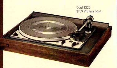 ![]() ![]() Every Dual, from the 1225 to the CS701, is designed to fulfill one basic concept: to provide more precision than you are ever likely to need. Perhaps this is why more component owners-audio experts, hifi editors, record reviewers and readers of the music/equipment magazines-own Duals than any other turntable. These serious music lovers, whose investment in records typically exceeds their investment in equipment, prefer Dual for only one reason. Quality. Until recently, Dual quality has been available only with fully automatic turntables with both single-play and multi-play facility. Now the choice is much broader. Of the seven Dual models, three are single-play only. Two of these are fully automatic; one is semi-automatic. Dual turntables also use all three types of drive systems: belt, rim and direct. The way a tonearm is moved to and from the record is not critical. Nor is the type of drive system. What is critical is how faithfully the tonearm permits the stylus to follow the contours of the groove and how accurately and quietly the platter rotates. If precision performance and reliability are of primary importance to you-as they should be you'll find them in every Dual. Dual 1225, $139.95, less base ... with the 1225, the lowest priced Dual ... all the turntable you may ever need. The Dual 1225 is a perfect example of Dual's basic concept: to build every Dual turntable with more precision than you are ever likely to need. The 1225's vernier adjustable low-mass counterbalanced tonearm can track flawlessly at as low as one gram. Stylus pressure is applied exactly as in every Dual, around the vertical pivot and perpendicular to the groove, maintaining perfect balance in all planes. Anti-skating force is also applied exactly as in every Dual, with separate calibrations for conical, elliptical and CD-4 styli. Other features the 1225 shares with all other Duals include pitch control variable over a 6% range (one semitone) and cue-control viscous-damped in both directions to prevent bounce. The powerful hi-torque motor maintains speed within 0.1% even when line voltage varies as much as 20%. The hefty 3% pound, 10%" diameter platter provides effective flywheel action to minimize the audible effect of any possible speed variation. There are two other models in this series, each with additional refinements. The 1226, priced at $169.95, has a one-piece, die-cast platter and a single-play spindle that rotates with the record. The 1228, priced at $199.95, has-in addition to these-a tonearm mounted in a four-point gimbal suspension, synchronous motor, built-in illuminated strobe and adjustable stylus angle to provide perfect vertical tracking in both single and multi play. Dual CS701, $400, including base and cover ...with the CS701, the quietest turntable ever made. Independent test reports on the electronic direct-drive Dual CS701 have been extraordinary. One reason is that all reviewers acknowledge the CS701's performance to be superior to the measuring capabilities of test instruments. For example: Hirsch-Houck Labs in Stereo Review found the wow level of the CS701 "Essentially at the residual level of our test record-about 0.03 percent." So did Popular Electronics. The Feldman Lab Report in FM Guide was able to detect "no flutter whatsoever!' Stereo & HiFi Times said "arm friction was lower than my capability to measure reliably." It takes very advanced engineering to achieve this level of performance. For example: the motor's unique double field coil produces a perfectly consistent rotating field with no magnetic flux irregularities. Another example: two specially tuned mechanical anti-resonance filters located within the tonearm counterbalance absorb resonant energy that would otherwise transmit acoustical feedback to the stylus. The result: cleaner and smoother frequency response. The reviewers also reached unequivocal conclusions about the CS701 performance. Note the absence of such qualifiers as "one of the" or "among the." For example: High Fidelity said: "..The Dual 701 has placed itself in the select group of products against which we must measure the performance of others." And the highly conservative English publication, HiFi News & Record Review: "The experience of listening to records of the highest quality on this turntable is not likely to be forgotten ...you will never again be satisfied with anything less perfect!" ... with the new Dual 1249, which will give you more reasons than ever to own a Dual. The new 1249, successor to the 1229Q, provides every feature, innovation and refinement of that highly-acclaimed model, plus some new ones. The 8%." tubular tonearm pivots in a newly designed four-point gyroscopic gimbal, suspended within a rigid frame. In single play, the tonearm parallels the record to provide perfect tracking; in multi play, the. Mode Selector lifts the entire tonearm to parallel the center of the stack. The tonearm can be set on the record manually or by using the viscous-damped cue-control or by simply pressing the automatic switch. In addition to single play and multiple play there is also the option of continuous repeat. The dynamically-balanced cast platter and flywheel are driven by an 8-pole synchronous motor via a precision-ground belt. Pitch is variable over a 6% range and can be set to exact speed by means of an illuminated strobe, read directly off the rim of the platter. A similar model, the 601, is available at lower cost ($249.95), without multi-play facility. A third Dual in this series, the 510 ($199.95) has a semi-automatic tonearm with a mechanical sensor that indicates when the tonearm is positioned precisely over the lead-in groove of a 12" or 7" record. At the end of play, the tonearm is automatically lifted by the cue-control and the motor shuts off. United Audio, 120 So. Columbus Ave., Mt. Vernon, N.Y. 10553 Exclusive U.S. Distribution Agency for Dual Also see: Source: Stereo Review (USA magazine) |
