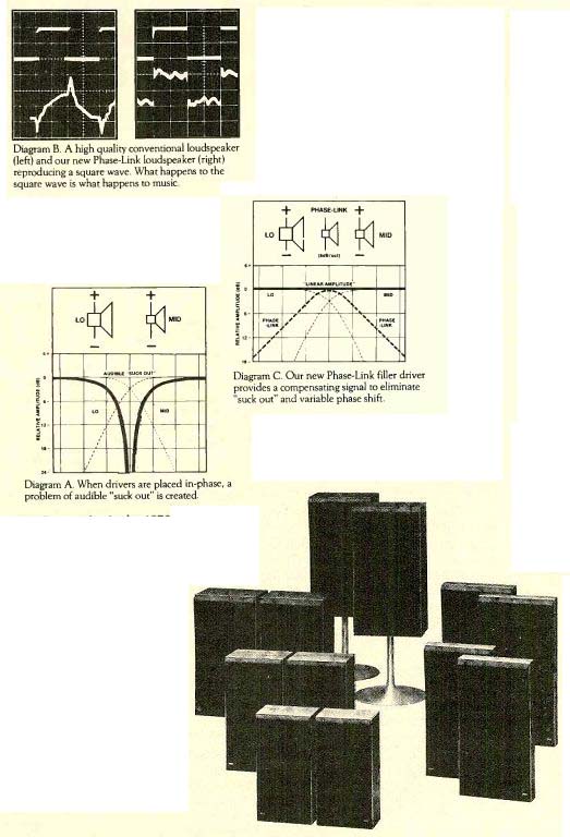 ![]() One reason you may be looking for new speakers could be the phase distortion present in those you listen to now.Phase Distortion Explained. Phase distortion is heard as a blurred sound picture and prevents accurate localization of instruments. It is most noticeable in the lower mid-frequency range at higher volumes. It occurs in most conventional, multi-way loudspeakers at the crossover point, when the same note is being reproduced by two drivers. Be cause today's high quality loudspeakers have virtually solved the problems of frequency response as well as harmonic and intermodulation distortion, the study and correction of phase distortion is all the more important if you are to literally recreate the original performance. --- Diagram A. When drivers are placed in-phase, a problem of audible "suck out' is created. Our Research. At the 1973 AES convention in Rotterdam, two Bang & Olufsen engineers, Madsen and Hansen, presented a paper on audible phase distortion. This paper represented three years of concentrated research within which they developed an electronic crossover, tri amplified loudspeaker that allowed them to demonstrate three important facts: 1. Phase distortion did indeed exist in loudspeakers. 2. That it was audible. (Hundreds of hours of critical listening tests confirmed this.) 3. That it could be effectively eliminated through sophisticated technology. --- Diagram B. A high quality conventional loudspeaker (left) and our new Phase-Link loudspeaker (right) reproducing a square wave. What happens to the square wave is what happens to music. Our Product. The experimental speaker developed by Madsen and Hansen was far too expensive to consider for distribution to the audio consumer. A practical solution had to be found. At this point, Bang & Olufsen engineer E. Baekgaard began his work with mathematical computer simulation. He discovered that the fixed phase shift, present in most conventional speakers (drivers alternated 180° out-of-phase) could be "cured" by placing all drivers in-phase. However, when this was done, an audible amplitude "suck out" was created (See diagram A.). It was to solve this problem that an additional narrow band filler driver--the Phase-Link Driver--was developed. Its compensating signal cured the amplitude "suck out" and the variable phase shift. It made the audible output of the loud speaker virtually identical to the input-the square wave, for example. Another Refinement. Phase-Link (tm) loudspeakers have their drivers mounted on a common acoustic axis so that the sound from each driver will reach your ears simultaneously. That is the reason for our slightly canted grill. --- Diagram C. Our new Phase-Link filler driver provides a compensating signal to eliminate “suck out" and variable phase shift. Your Listening Experience. The importance of our new Phase-Links technology and square wave tests is of course determined by the fidelity of the music recreated by our speakers. It is your sensitivity to the accurate reproduction of music that will give them their severest test. It is our technology which will insure they pass, for rarely has technology served music so well. Because the ear is sensitive to phase distortion mainly in the lower mid-frequencies, Phase-Link is used between the low-frequency driver and the mid range unit in the high power, 3-way systems (M-70, S-60) but not between the mid-range and tweeter. In medium-power, 2-way systems, one Phase-Link driver is used in 12dB/oct. filter combinations (S-45, P-45). Low-power, 2-way systems (S-30, P-30) do not utilize a Phase-Link driver but instead eliminate phase distortion through a sophisticated 6dB/oct. filter technique. Bang & Olufsen speakers include the M-70, shown on trumpet stand (supplied), three bookshelf models, the S-60, S-45, and S-30, and two wall panel speakers, the P-45 and P-30. Bang & Olufsen Bang & Olufsen of America, Inc., 515 Busse Road, Elk Grove Village, Illinois 60007, USA. Also see: |