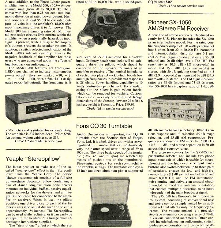 The Model 200 features six front-panel LED's per channel to indicate instantaneous power output. They are marked-20,-12, -9,-6, and-3 dB, with a final LED designated PEAK (full output). The front panel is 19 x 51/2 inches and is suitable for rack mounting. The amplifier is 8 3/4 inches deep. Price: $398. An optional walnut cabinet costs $36. Yeaple "Stereopillow" The latest product to make use of the so called "near-phone" effect is the "Stereopillow" from the Yeaple Corp. The device (shown disassembled) consists of a full-size polyurethane decorator pillow containing a pair of 4-inch long-excursion cone drivers mounted on individual baffles, passive equalization networks for the drivers, and an integral 30-foot cable for connection to the amplifier or receiver. When in use, the pillow positions one driver close to each of the listener's ears (the actual distance to the ear is approximately 1 1/2 inches). The Stereopillow can be used while reclining, or it can easily be strapped to the headrest of a lounge chair according to instructions supplied. The "near-phone" effect on which the Stereopillow is based predicts that when a listener's ear is significantly closer to the front of a speaker cone than to the back, normal front-to-back acoustical cancellation of lower frequencies will be much less pronounced than for a remote listener. Therefore, satisfactory low-frequency response can be obtained with a simple flat baffle rather than a full enclosure for the driver. Frequency response for the Stereopillow is rated at 30 to 16,000 Hz, with a sound-pressure level of 95 dB achieved for a 1/2-watt input. Ordinary headphone jacks will not adequately drive the pillow, which should be connected to the speaker terminals of an amplifier or receiver. The nominal impedance of each driver plus network (which boosts low and high frequencies to provide flat response) is 28 ohms. Power-handling capability is 10 watts continuous per channel. The standard casing, for the pillow is gold velour fabric, which can be removed for washing. Custom-fabric cases can easily be substituted. Rough dimensions of the Stereopillow are 27 x 20 x 6 inches; weight is 8 pounds. Price: $79.95. Fons CQ 30 Turntable Audio Dimensions is importing the CQ 30 turntable from the Scottish firm of Fergus Fons, Ltd. It is a belt-driven unit with a servo-regulated d.c. motor that can continuously vary the platter speed over a range of 29 to 100 rpm. The three basic speeds of the turntable (331A, 45, and 78 rpm) are selected by means of pushbuttons on the motorboard. Fine-tuning controls for each speed achieve the variable settings. The turntable employs a 12-inch anodized aluminum platter supported by a precision bearing. A suspension system built into the base isolates the mechanism from external shock and vibration. Rumble is said to be less than-79 dB; wow and flutter are under 0.03 percent. The unit has a walnut base and a hinged dust cover. Dimensions are 17 1/2 x 13 3/4 x 6 1/3 inches. The basic turntable is supplied without a tone arm at a price of $300. With a factory-installed SME tone arm the CQ 30 costs $465. Pioneer SX-1050 AM/Stereo FM Receiver A new line of stereo receivers introduced recently by U.S. Pioneer includes the SX-1050 as an intermediate model. For the rated continuous power output of 120 watts per channel into 8 ohms from 20 to 20,000 Hz, harmonic and intermodulation distortion are 0.1 percent or less. Signal-to-noise ratios are 75 dB (phono) and 90 dB (high-level). The IHF FM sensitivity is 10.3 dBf (1.8 microvolts) in mono and 15.7 dBf (3.35 microvolts) in stereo, with 50-dB quieting specified at 14.5 dBf (2.9 microvolts) in mono and 36 dBf (34.5 microvolts) in stereo. The FM signal-to-noise ratios are 78 dB (mono) and 73 dB (stereo). The SX-1050 has a capture ratio of 1 dB, 80-dB alternate-channel selectivity, 100-dB spurious-response and i.f. rejection, 85-dB image rejection, and 55-dB AM suppression. Frequency response on FM is 30 to 15,000 Hz +0.3,-1 dB, and stereo separation is 30 dB across this frequency range. The program sources for the SX-1050 are pushbutton-selected and include two phono inputs (one pair of which is usable for micro phones) and one high-level Aux input. Push buttons also switch between up to three pairs of speakers, engage the low- and high-frequency filters (12 dB per octave below 30 and above 8,000 Hz) and the FM interstation noise muting, and activate an unusual circuit (intended to facilitate antenna orientation) that enables multipath distortion to be heard independent of the main broadcast signal. The SX-1050 has Pioneer's twin tone-control system, consisting of conventional bass and treble controls supplemented by an additional set that affects only the frequency extremes. The volume control is a precision step-type attenuator covering a range of 70 dB in various calibrated increments. Other controls include balance, an audio muting switch, loudness-compensation and tone-control de feat switches, stereo/mono mode, an in/out switch for any external signal processor that might be connected to the receiver, and complete tape-monitor and tape-duplication switching for two tape decks. The SX-1050 has tuning meters to indicate channel center and signal strength; illuminated legends identify program source and mode as they are selected. A stereo headphone jack and two microphone inputs are provided on the front panel. The receiver measures 20.33 x 6 3/4 x 17 7/8 inches and weighs 51 1/2 pounds. Its top and sides are enclosed by walnut-veneer panels. Approximate price: under $700. Two other models in the new Pioneer line, the SX-1250 and the SX-950, have rated power outputs of 160 and 85 watts per channel, respectively, and otherwise similar performance specifications and features. Celestion UL Speaker Systems: Rocelco Inc., North American distributor for the English Rola Celestion and Ditton products, has announced the introduction of the UL series of Celestion speaker systems. The 