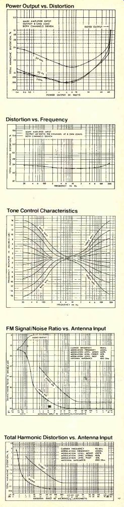 In the past few years, good specifications have become a relative commonplace in the consumer electronics industry. And, as the statistical gaps between comparably priced units lessened, other factors gained more importance. Most notably, design and the componentry that's used. Nothing could suit us better. For twenty-three years, the strength of our reputation has rested primarily on the excellence of our engineering. The new S7910 is a case in point. With a power output of 60 watts per channel [minimum FMS at 8 ohms from 20-20,000 Hz] with no more than 0.1% Total Harmonic Distortion, the S7910 is clearly equipped to serve as the center point of the most progressive music systems. More to the point, though, is the componentry that permits this capability. The output devices are paralleled OCL direct-coupled. This configuration, combined with the high voltage and current ratings of the output de vices, creates an extremely stable circuit. Additionally, the massive power transformer and twin 12,000 uf filter capacitors, backed by a zener regulated secondary power supply, ensure the S7910's ability to perform well beyond the demands of normal use. The S7910's IHF FM Sensitivity rating is 9.84 dBf [1.7 µV]. That's one of the finest ratings attain able-and it can only be achieved through the utilization of superior componentry. 4-ganged tuning capacitors. Dual-Gate MOS FET's. Phase Lock Loop MPX. Ceramic FM IF Phase Linear Filters. And Sherwood's newly-developed digital detector, which introduces virtually no distortion to the signal and never requires alignment. The front panel of the S7910 reflects every significant function of current hi-fidelity technology. And again, the componentry behind the faceplate is the finest available. [For example, the 3-stage Baxandall tone circuit employed for the Bass and Treble controls.] Other features, such as the Master Tone Defeat switch, switchable FM deemphasis and FM Stereo Only, and two front panel tape dubbing jacks, contribute to an operational versatility that is truly outstanding. In every respect, the S7910 demonstrates the attention to detail, the on-going effort to refine existing solutions and discover better ones, that has characterized Sherwood throughout the years. You might be able to find another receiver in this price range that offers similar specifications-on paper. But you won't find a receiver that's been more meticulously designed, or more carefully produced. At Sherwood, we approach the business of creating receivers like an art. Because no approach brings you closer to reality. Sherwood Electronic Laboratories, Inc. 4300 North California Avenue Chicago, Illinois 60618 USA. For a more complete description of Sherwood's unique approach to audio equipment engineering, write to the address above. We'll mail you a copy of our new brochure, "The. anatomy of high performance design," along with detailed information about the new S7910. SHERWOOD--Everything you hear is true. --The value shown is for informational purposes only. The actual resale price will be set by the individual Sherwood Dealer at his option. The cabinet shown is constructed of select plywood with a walnut veneer covering. ---Model 58910 offers identical specifications and features, but is FM only. ![]() Also see: |