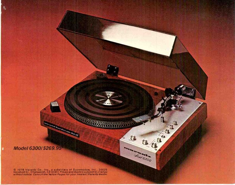 High on performance, the belt-drive 6100 features a super-dependable AC synchro nous motor. The convenience of auto return and shut off, Plus full protection of your valuable records with a precision S shaped tone arm, gentle-action viscous-damped cueing and anti-skate. FOR THE BUTTON-PUSHER. THE TOTALLY AUTOMATIC 6200. It's auto-everything. Auto start. Auto return and shut off. Auto repeat. Operates manually, as well. A servo motor, coupled with belt drive, assures optimum speed accuracy. Stroboscopic pitch control "fine tunes' speed to compensate for off-pitch records or for playing along with a musical instrument. The 6200 cares for your records, too, with a precision S-shaped tone arm, gentle-action viscous-damped cueing and anti-skate. Model 6200/$199.95 Model 61001 $129.95 Suggested list prices. Actual selling prices at dealer's discretion. All models come comp ete with anti-static turntable mat, plastic hinged dust cover, base enclosure, and low capacitance phono cables that assure 4-channel capability whenever you need it. The base enclosure for the 6300 is constructed of plywood, finished in genuine walnut veneer. The enclosures for the 6200 and 6100 are finished in walnut grain vinyl veneer FOR THE TOP-OF-THE-LINER. THE DIRECT DRIVE, OPTO-COUPLED AUTO LIFT 6300. Features and technological excellence galore. Starting with absolute speed accuracy assured by a combination of direct drive design and DC servo motor that automatically compensates for voltage/speed fluctuations. Of course, there's auto lift and shut off, but on the 6300 it's opto-coupled--a significant Marantz exclusive. It means no tracking distortion caused by mechanical linkage between auto mechanism and tone arm. The secret: a tiny beam from a light-emitting diode maintains constant contact with a photo transistor during play. At record's end, a sliding blade cuts contact, activating a circuit that lifts the tone arm and shuts off the motor. There's more. Stroboscopic pitch control "fine-tunes" speed to your personal preference. And viscous damped cueing gently, smoothly lowers the precision S-shaped tone arm onto the sensitive disk surface. Vertical/ lateral counter balancing and anti-skate result in lowest distortion and tracking error. Marantz We sound better. Model 6300/ $269. 1976 Marantz Co., Inc., a subsidiary of Superscope, Inc., 20525 Nordhoff St, Chatsworth, CA 91311. Prices and models subject to change without notice. Consult the Yellow Pages for your nearest Marantz dealer.