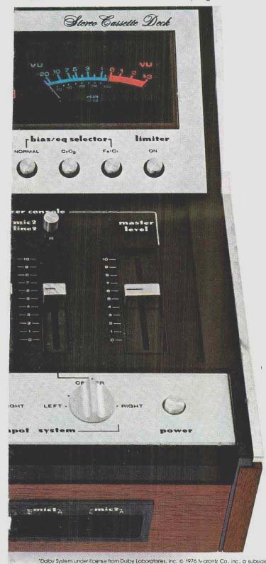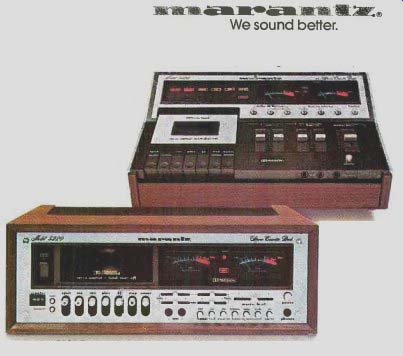 ![]() ![]() ![]() Marantz Stereo Cassette Decks--- the decks that live up to their name.----------- [1] 3- 1/2-inch professional VU meters with peak LED overload and lighted function indicators. Exceptionally large, readable VU panel features special Light Emitting Diodes that illuminate when recorder is overdriven by a high level signal. Illuminated function indicators tell you at a glance which function is in operation. [2] Built-in Dolby System that works with built-in mixing console; also permits external Dolby processing on other tape recorders. Instantly switches for external Dolby encoding on reel-to-reel decks. Has 25 microsecond de-emphasis switch for FM Dolby. Works in conjunction with built-in mixer for Dolbyizing multiple input sources. [3] One button each for Normal, CrO2 and FeCr tapes automatically selects both bias and EQ. Eliminates confusing combination adjustments of separate bias and EQ switches. Single control calibrates both bias and EQ automatically for best frequency response on any cassette tape. [4] Full 4-input mixing console with pan pot and master gain control. Four inputs-any combination of mic and line-are operated by four individual slide potentiometers plus one master gain control for fade-in/fade-out. Two pan pot controls permit inputs 3 and 4 to be assigned to either left, center or right stage. Can operate as a separate mixing panel for master-quality recordings with external tape recorders. [5] Built-in adjust able stand that changes the angle of the control panel from flat to 20 degrees. Angles top loading decks for most suitable viewing and operation. ------- Marantz cassette decks. Performance and sophistication that surpasses every other deck line on the market. Quality and technical excellence equaled only by Marantz receivers, components and speaker systems. Top loading. Front loading. With Dolby. Without Dolby. The Marantz cassette deck line lets you select a model that exactly suits your needs. Six decks in all, with design features as exciting as their performance. The Marantz 5420 top loading deck with Dolby for example, keeps wow and flutter down to 0.07%. Plus, it offers a wide frequency response (30 Hz to 17 kHz) and an exceptionally high signal-to-noise ratio (up to 60 dB). Other outstanding features include long-life ferrite heads, sophisticated DC servo drive systems with total shut-off and memory tape counters. See the complete Marantz line at your local Marantz dealer. Send for a free catalog. We sound better. Marantz 5120 Top Loading Deck with Dolby Marantz 5220 Front Loading Deck with Dolby (Cabinet optional) Not shown. Marantz 5400 Top Loading Deck without Dolby, Marantz 5200 Front Loading Deck without Dolby, and Marantz 5020 Front Loading Deck with Dolby. 'Dolby System under license from Dolby Laboratories, Inc. 1976 Marantz Co., Inc., a subsidiary of Superscope. Inc.. 20525 Nordhoff St., Chatsworth, CA 91311. In Europe: Superscope Europe, S.A. Brussels. Belgium. In Canada: Superscope Canada. Ltd. Ontario. In the Far East, Marantz For East, Tokyo, Japan. Prices and models subject to change without notice. Consult the Yellow Pages for your nearest Marantz dealer.