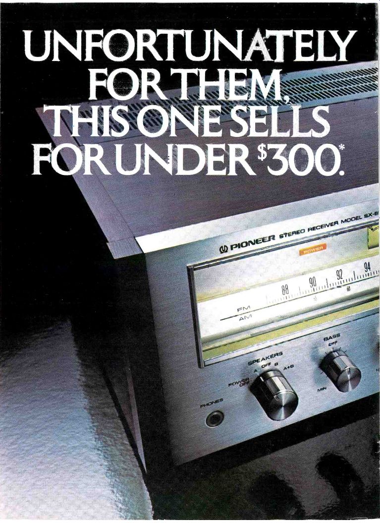 The average $600 receiver sounds as good as the new Pioneer SX-650 until you start listening to prices. If $600 is your kind of price, an SX-650 should qualify as your kind of receiver. Not only will it give you the kind of features and sound quality you'd expect for that kind of money; it'll also leave you with roughly half your receiver budget unexpectedly unspent. But suppose your idea of a receiver price is somewhere under $300 The SX-650 is going to sound better to you than anything you thought you could afford. Because it has more power, a wider frequency range, less distortion, and far greater versatility than most other receivers in that category. All this might sound a little extravagant; but an authentic breakthrough, an achievement like the SX-650, doesn't happen often. We've learned that when our promises seem to sound especially rich, the best thing to do is simply review the facts. It's a fact that the SX-650 provides a continuous power output of 35 watts per channel, min. RMS into 8 ohms, from 20 to 20,000 Hz, with no more than 0.3% total harmonic distortion. It also delivers each instrument and voice at its intended level, balanced within ± 0.3% of the RIGA curve. The facts of its stereo separation, selectivity and sensitivity, however, must be experienced: numbers are impressive, but sometimes only hearing is believing. You'll also be impressed by what you don't hear from the SX-650. You won't hear an assortment of background noises, or the thousand miscellaneous acoustic devils that live in the limbo between FM stations on lesser receivers. On your next visit to a high fidelity dealer, listen to a Pioneer SX-650 with any reasonably accurate speakers. You'll find either its price or its performance amazing. Depending on which you hear first. PIONEER U.S. Pioneer Electronics corp. , Moonachie: New Jersey 07074. Promotional purposes only, the SX-650 is priced under $300. The actual resale price will be set by the individual Pioneer dealer at his option. Also see: LETTERS TO THE EDITOR (Feb 1977) AUDIO BASICS: The Greater Good TANDBERG (ad) Source: Stereo Review (USA magazine) |