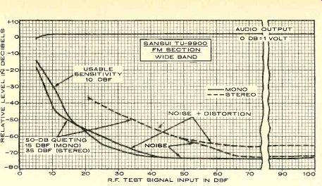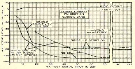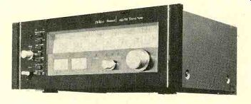 The output stages, featuring fully complementary-symmetry transistors, are directly coupled to the speakers. A fast-acting relay protects both the output devices and the speakers from damage, as well as providing a time delay that eliminates thumps when turning the receiver on or off. At its input, the KR-9600 is unique in having separate preamplifiers for each of the two phono in puts. The PHONO 1 input, which has a 2.5-millivolt sensitivity and a 250-millivolt overload rating, uses an FET input; the PHONO 2 preamplifier, rated at 5 millivolts sensitivity with a 500-millivolt overload rating, uses a bi polar-transistor input. The KR-9600's tone controls consist of knobs for bass, mid-range, and treble frequencies. They can be bypassed by a DEFEAT switch. The tone controls, like the volume control, are lightly but positively detented in steps. The receiver can control two tape decks, with front-panel switching for recording on either machine or dubbing from either one to the other, while monitoring the play back from either one or listening to the source signal. A novel feature is the receiver's "sound injection" circuit, a variant of the microphone injection system found on some other receivers. Kenwood's system provides a fading and mixing action as the mrc LEVEL knob on the panel is rotated. It smoothly fades out the signal from the selected program source and inserts the signal from a microphone plugged into the front-panel jack. This injection action takes place only at the tape-recording outputs and does not appear in the receiver's audio outputs. The FM tuner section of the receiver is of comparable quality, featuring two r.f. stages, a five-gang tuning capacitor, an eight-element linear-phase filter, and a phase-locked-loop multiplex demodulator. A switch on the front panel converts the de-emphasis time constant from 75 to 25 microseconds for use with an external Dolby adapter. The two tuning meters read channel center and signal strength for FM (the latter is also the AM tuning indicator). A button on the front panel converts the signal-strength meter to read FM modulation strength, from 0 to 100 percent. In this mode, the meter has a fast response with little overshoot, and it can be used to set up recording levels on a tape deck for most effective use of the machine's dynamic range. Two other meters monitor the audio-output levels. Their logarithmic scales read from 0.1 to 200 watts, and a nearby but ton increases the meter sensitivity to cover a 0.01- to 3-watt range. The Kenwood KR-9600, as might be expected, is large and heavy. Its satin-finish front panel is 22-Th inches wide and 6 3/8 inches high; the receiver extends about 16 1/2 inches behind the panel. All rear connectors are recessed and do not protrude beyond the case limits. A pair of rugged and attractive handles are supplied for mounting on the panel if de sired (the 53-pound weight of the receiver makes this very desirable), and the overall depth of the receiver including handles is 18 1/8 inches. The front panel has pushbutton switches for low- and high-cut filters, 20-dB audio muting, power-meter range selection, FM meter mode, 25-microsecond de-emphasis, and FM muting. The large tuning knob, which operates a very smooth flywheel mechanism, is to the right of the dial. Across the bottom of the panel are knobs for the tone controls, volume (with a concentric ring for balance), the input selector (AM, FM, PHONO 1, PHONO 2, Aux), and speaker switching for three pairs of speakers or one combination of two pairs. Lever switches control on/off, loudness (with two degrees of compensation), tone-control defeat, mode (MONO, STEREO, REVERSE), tape monitoring from either deck or the source, dubbing from either deck to the other, and the SOUND INJECTION circuit. There is also a headphone jack on the panel. In the rear of the receiver are the many in put and output jacks, including preamplifier outputs and main-amplifier inputs, joined by removable jumper links. There are outputs for connection to an oscilloscope for multipath indication; the horizontal output is also intended to drive any future discrete four-channel FM decoder when and if it becomes available. There is a hinged AM ferrite-rod antenna, and terminals are provided for 75- and 300-ohm FM antennas as well as an AM wire antenna. Insulated spring clips are used for the speaker outputs, and there are DIN sockets as well as phono jacks for the tape-recorder connections. One of the three a.c. sockets is switched. Price: $750. Laboratory Measurements. Following the standard preconditioning period, during which the receiver became only moderately warm, the amplifier outputs clipped at 189 watts into 8 ohms, 264 watts into 4 ohms, and 115.5 watts into 16 ohms (both channels driven at 1,000 Hz). At most power levels and frequencies, the distortion was below our residual measurement level of about 0.003 percent. With a 1,000-Hz test signal, total harmonic distortion (THD) was less than 0.003 percent at all levels from 10 watts up to 180 watts, reaching 0.006 percent at 190 watts just before clipping occurred. The intermodulation distortion (IM) was between 0.015 and 0.03 percent from 1 watt to over 190 watts. It rose somewhat at very low power levels-about 0.2 percent at 16 milliwatts. At the rated power output and at levels of-3 and-10 dB, the THD was about 0.02 percent at 20 Hz and less than 0.003 percent from a couple of hundred Hz to 10,000 Hz, climbing to 0.008 percent at 20,000 Hz.