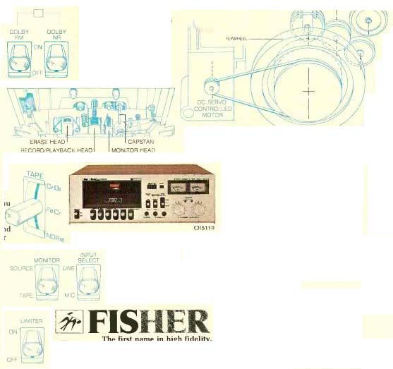 Fisher manufactures only 3-head cassette decks. For the important reason that all professional recordings are made on 3-head decks. The only way to make consistently perfect, high fidelity tape recordings is to listen to the sound as it is recorded. The way professional recording studios do. The 3-head design of the Fisher CR5115 and CR5110 permits monitoring directly off the tape while recording. You hear exactly what is recorded on the tape. No second guessing. No hoping for the best. No more poor recordings or missed opportunities because of operational errors or tape problems. The CR5115 and CR5110 incorporate four preamplifiers- two for recording and two for monitoring. Two head decks use two preamplifiers. A Tape/Source switch enables LINE instantaneous comparisons to be made between the TA PE incoming signal (source) and the recorded signal (tape). Indicator lights for each mode let you see at a glance which signal is being monitored. Tape Heads, The CR5115 and CR5110 have separate heads for erase, record/playback, and monitor. The CR5115 uses ferrite heads for extremely long life and superior frequency response. Tape Transport. In the CR5110 a large, dynamically-balanced heavy weight flywheel is driven by a regulated speed DC motor. The CR5115 uses servo control to provide even more precise tape speed. A precision-ground capstan provides good tape-to-head contact and accurate tape movement. Wow and flutter on the CR5110 is less than 0.09% WRMS; on the CR5115, less than 0.07% WRMS. Limiter. The CR5115 has switchable limiter circuitry to prevent excessive peak levels from causing distortion. Sudden loud passages are automatically ,F, recorded at the maximum distortion-free level- without affecting the overall input level and while maintaining high signal-to-noise performance -- better than 58dB with Dolby. Tape Selector. Fisher includes a three-position tape select switch which sets the recording electronics for all of the latest tape formulations. You get full compatibility between recording circuitry and the type of tape used...for CrO2, and standard tapes, as well as FeCr tape. CR5115 and CR5110 have built-in DOLBY noise reduction FM NR circuitry. It virtually eliminates tape hiss and improves the (, signal-to-noise ratio by as much as 10dB. The CR5115 has switchable Dolby FM circuitry, complete with the 25 micro-second de-emphasis necessary for the proper demodulation of Dolby-encoded broadcasts. Even if your receiver has no FM. Dolby circuitry built-in, you can enjoy the full dynamics and noise-free reception of Dolby-encoded FM with the CR5115. CR5110 It's really easy to tell Fisher tape decks from all the others. Compare the features and specs of the CR5110 (priced at $199.95*) and the CR5115 (priced at $249.95), and you'll see why they're the best value around. Now at fine audio stores. Fisher Corporation, 21314 Lassen Street, Chatsworth, Calif. 91311 FISHER The first name in high fidelity. CR5115 ![]() Dolby is trademark of Dolby Labs. Inc. Mfg. suggested retail price. Actual sale price determined by dealer. Also see: THE POP BEAT, PAULETTE WEISS |
