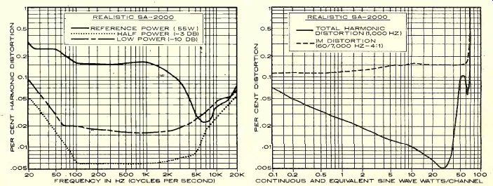 EQUIPMENT TEST REPORTS: Hirsch-Houck Laboratory test results on the: Audio Pulse Model One time-delay system, Avid 101 speaker system, Realistic SA-2000 integrated stereo amplifier, and Shure M24H stereo/quadraphonic phono cartridge, JULIAN D. HIRSCH. ------------- By Hirsch-Houck Laboratories Audio Pulse Model One Time-delay System ![]() DESPITE the advances in the state of the high-fidelity art, the fact remains that re corded music reproduced in the home still simply does not sound like the real thing. It can sound very good-perhaps in some respects "better" than live-but, in general, it does not sound enough like an actual performance to fool anyone for a moment. One of the major reasons for this is the limitations that prevent the reproduced program from conveying the ambiance of the original concert hall or other recording acoustic. It is this sense of spaciousness, related to the reverberation and absorption characteristics of the original environment, that is so difficult to capture in a recording and to re-create subsequently at home. At one time, quadraphony seemed to be an answer to the problem. It seemed plausible that a second pair of microphones, located at some distance from the performers, would pick up a greater proportion of the reflected sound in the hall. Recorded on two additional channels and reproduced through suitably placed speakers, this should be able to impose some of the acoustic qualities of the concert hall on the sound of the listening room. Some recordings made in this manner accomplish this very well, creating a more convincing illusion of an actual performance than was possible with two-channel stereo. However, the major manufacturers of four-channel records, presumably following the dictates of the marketplace, have gone heavily into "surround sound" effects. These are certainly impressive and even fun to listen to, but they are "sound effects," farther from reality than mono records were, to say nothing of ordinary stereo discs. There are other ways besides quadraphony to restore a convincing ambiance to recorded sound. One method is to establish a separate delayed signal path, combine a number of differently delayed components into a single reverberant signal, and then play this signal through auxiliary speakers located toward the rear of the room. If the delay times, the manner in which they are blended between channels and re-circulated within each channel, the placement of the auxiliary speakers, and the balance between the direct and reverberant sound sources are all properly adjusted, the result can be astonishingly natural sound. Perhaps best of all, this process can be applied to any program source, stereo or mono, without the need for any special recording techniques. Artificial time-delay devices have been used (and sometimes abused) by the recording industry for some years. Until recently, they have been bulky and very expensive altogether unsuitable for home use. Originally they were mechanical devices, using springs or long air columns to achieve the necessary time delays, but it is now feasible to do much the same thing using electronics alone. The Audio Pulse Model One Time Delay System is an example of a unit that takes such an approach. (Audio Pulse is a division of Hybrid Systems, a well established manufacturer of analog and digital circuitry for commercial and military applications.) The Model One, its manufacturer's first consumer product, contains some ninety IC's in its active circuitry. We have used an Audio Pulse Model One for several months in several different listening rooms. Our experience has given us a pretty clear idea of what it can and cannot do (need less to say, it is not a panacea for all the ills of the recording and hi-fi worlds). It also confirmed our suspicion that any type of objective testing would be fruitless because of the difficulty of interpreting the results and the lack of any frame of reference for com parison purposes. Therefore, our evaluation of the Audio Pulse Model One will be entirely subjective. Description. The Audio Pulse Model One accepts stereo or mono inputs from the tape outputs of an amplifier or receiver (or the main preamplifier output if that is more convenient) and passes them on unmodified to the normal front-channel amplifier and speakers. It also converts these input signals from their analog form into a series of digital pulses at a sampling rate of 250,000 Hz. Before the analog-to-digital conversion, the bandwidth of the input signal is reduced to about 8,000 Hz. This is done partly because of the requirements of the digital conversion process, but also because in a typical concert hall the reverberant sound that reaches the audience has lost most of its high-frequency energy through absorption. In digital form the signals (held separate for the two channels) are passed through a series of shift registers. The shift registers form a memory system capable of storing signals for extended periods. An internal clock signal transfers the contents of each register to the next one as new pulse signals enter the delay system. The output of the last register is converted back to analog form, filtered to remove the "rough edges" from the reconstructed waveform, and made available at the output terminals of the Model One. The number of shift registers through which the signal passes (and the rate at which it is transferred between them) sets the total delay time. In the Audio Pulse Model One, there are four initial delays, varying from 8 to 94 milliseconds (ms). These delayed signals are fed back to the input of the device and recirculated to simulate the multiple reflections that take place in a real room. The recirculation takes place within each channel, and between channels through a cross-feed circuit. --------------- ![]() Physically, the Audio Pulse Model One is a black box 14 1/2 inches wide, 10 inches deep, and 4 1/2 inches high with walnut side panels. Its principal controls are 