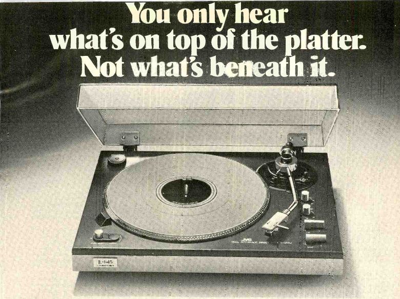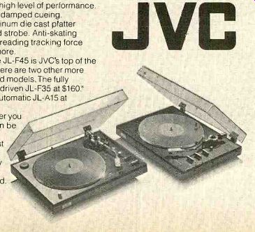 You can always distinguish the excellence of a turntable by its capability to rotate a platter precisely, at a given speed, without adding rumble, wow and flutter to the performance. ![]() Because JVC's new JL-F45 turntable platter is directly driven by a specially designed DC servo motor, any rumble-producing effect is virtually nonexistent. The result is outstanding measurements that defy audibility. Rumble is better than 70dB (DIN B) and wow and flutter is less than 0.03% (WRMS). Even some of the most expensive turntables don't measure up to the excellence of these specifications. In addition to the precision of direct-drive, the JL-F45 offers dual options for operation. Manual. And completely automatic. Ad to Lead in. Auto Return. Auto Stop. You can even repeat play a record automatically up to six times-or infinitely. The JL-F45's exclusively designed Tracing-Hold tonearm assures the highest degree of groove tracking with unusually low tracking error. This is absolutely essential for today's ultra low tracking cartridges, including CD-4. The new uni-point gimbal suspension system reduces unwanted friction and overcomes unexpected jolts to the arm. Every feature you're likely to want in a quality turntable contributes to this 2-speed unit's high level of performance. 2-way viscous-damped cueing. A 12-inch aluminum die cast platter with illuminated strobe. Anti-skating control. Direct-reading tracking force dial. And lots more. While the JL-F45 is JVC's top of the line at $250 there are two other more modestly priced models. The fully automatic belt-driven JL-F35 at $160, And the semi-automatic JL-A15 at $130. Whichever you choose, you can be sure you're getting the most turntable precision, reliability and value JVC has ever offered. JVC America. Inc., 58-75 Queens Midtown Expressway, Maspeth, 11378 (212) 476-8300. Canada: JVC Electronics of Canada, Ltd., Scarborough, Ont. Outside N.Y call toll-free 800-221-7502 for nearest dealer. ![]() *Approximate retail value, including base and dust Cover. ------ Also see: |