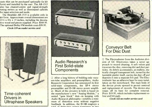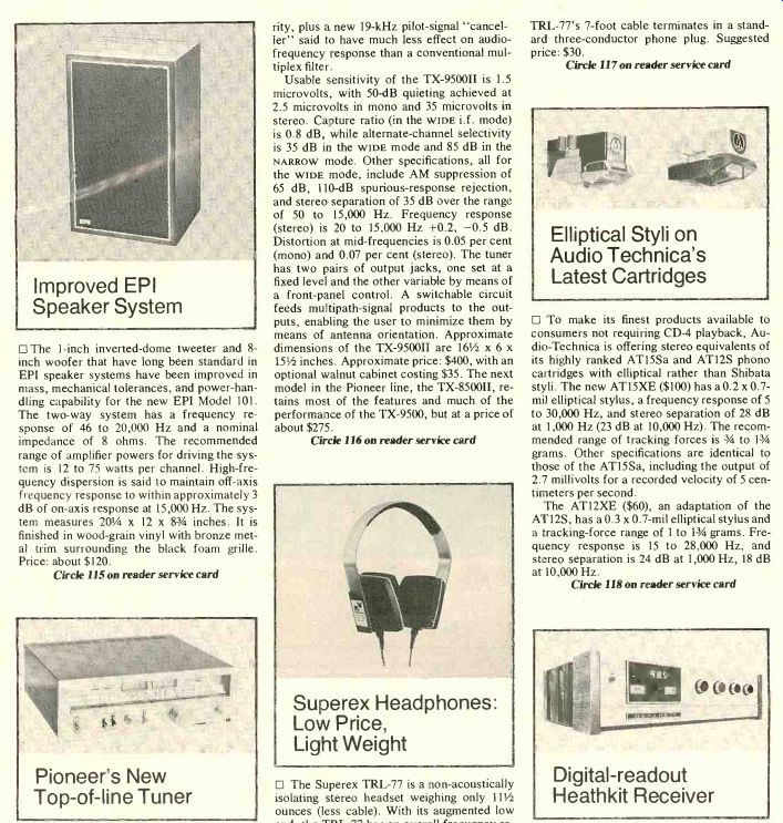 Improved EPI Speaker System The 1-inch inverted-dome tweeter and 8-inch woofer that have long been standard in EPI speaker systems have been improved in mass, mechanical tolerances, and power-handling capability for the new EPI Model 101. The two-way system has a frequency response of 46 to 20,000 Hz and a nominal impedance of 8 ohms. The recommended range of amplifier powers for driving the sys tem is 12 to 75 watts per channel. High-frequency dispersion is said to maintain off-axis frequency response to within approximately 3 dB of on-axis response at 15,000 Hz. The sys tem measures 20 1/4 x 12 x 8 3/4 inches. It is finished in wood-grain vinyl with bronze met al trim surrounding the black foam grille. Price: about $120. Pioneer's New Top-of-line Tuner The TX-9500II has taken its place at the top of Pioneer's line of AM/FM stereo tuners. Among its features are switchable i.f. band width (WIDE or NARROW) to provide a choice between maximum selectivity and maximum signal quality, a built-in test-tone oscillator to aid in setting tape-recording levels, and a choice of two degrees of FM interstation noise muting. Internally, the TX-9500II has a newly developed filter in its i.f. section that combines high effectiveness with phase linearity, plus a new 19-kHz pilot-signal "canceller" said to have much less effect on audio-frequency response than a conventional multiplex filter. Usable sensitivity of the TX-9500II is 1.5 microvolts, with 50-dB quieting achieved at 2.5 microvolts in mono and 35 microvolts in stereo. Capture ratio (in the WIDE i.f. mode) is 0.8 dB, while alternate-channel selectivity is 35 dB in the WIDE mode and 85 dB in the NARROW mode. Other specifications, all for the WIDE mode, include AM suppression of 65 dB, 110-dB spurious-response rejection, and stereo, separation of 35 dB over the range of 50 to 15,000 Hz. Frequency response (stereo) is 20 to 15,000 Hz +0.2, -0.5 dB. Distortion at mid-frequencies is 0.05 percent (mono) and 0.07 percent (stereo). The tuner has two pairs of output jacks, one set at a fixed level and the other variable by means of a front-panel control. A switchable circuit feeds multipath-signal products to the out puts, enabling the user to minimize them by means of antenna orientation. Approximate dimensions of the TX-9500II are 16 1/2 x 6 x 15 1/2 inches. Approximate price: $400, with an optional walnut cabinet costing $35. The next model in the Pioneer line, the TX-8500II, retains most of the features and much of the performance of the TX-9500, but at a price of about $275. Superex Headphones: Low Price, Light Weight The Superex TRL-77 is a non-acoustically isolating stereo headset weighing only 11 1/2 ounces (less cable). With its augmented low end, the TRL-77 has an overall frequency response of 25 to 20,000 Hz. The phones em ploy Mylar diaphragms within compact mold ed earpieces with user-replaceable foam cushions. The padded headband is a single piece of stainless steel. With an impedance appropriate for the headphone jacks of virtually any receiver or integrated amplifier, the headset produces a sound-pressure level of 100 dB with an input of 5 milliwatts. For a mid-range signal at that level, distortion is 0.65 percent. The TRL-77's 7-foot cable terminates in a standard three-conductor phone plug. Suggested price: $30. Elliptical Styli on Audio Technica's Latest Cartridges To make its finest products available to consumers not requiring CD-4 playback, Audio-Technica is offering stereo equivalents of its highly ranked AT15Sa and AT12S phono cartridges with elliptical rather than Shibata styli. The new AT15XE ($100) has a 0.2 x 0.7-mil elliptical stylus, a frequency response of 5 to 30,000 Hz, and stereo separation of 28 dB at 1,000 Hz (23 dB at 10,000 Hz). The recommended range of tracking forces is 3/4 to 13/4 grams. Other specifications are identical to those of the AT15Sa, including the output of 2.7 millivolts for a recorded velocity of 5 centimeters per second. The AT12XE ($60), an adaptation of the AT12S, has a 0.3 x 0.7-mil elliptical stylus and a tracking-force range of 1 to 14/4 grams. Frequency response is 15 to 28,000 Hz, and stereo separation is 24 dB at 1,000 Hz, 18 dB at 10,000 Hz. Digital-readout Heathkit Receiver The top of Heath Company's receiver line is now the AM/FM stereo AR-1515, equipped with a half-inch LED/digital display to indicate the tuned frequency. Power output is 70 watts per channel into 8 ohms on a continuous basis, with less than 0.08 percent harmonic or intermodulation distortion. The high-level in puts have a signal-to-noise ratio of 80 dB. The phono inputs, referred to a 2-millivolt input signal, have a 65-dB signal-to-noise ratio. On FM the AR-1515 has a usable sensitivity of 1.8 microvolts, a capture ratio of 1.3 dB, and alternate-channel selectivity of 100 dB. Image rejection is 90 dB, and AM suppression is 65 dB. The FM frequency response is 20 to 15,000 Hz ±1 dB. Only the main controls-tuning, mode, in put selector, and volume-appear on the front panel. The rest are concealed behind a hinged trim section that flips down. These include main and remote speaker switching, balance, bass, and treble controls, FM interstation noise muting, high-frequency blend (for FM), tone-control defeat, high-frequency and sub sonic filters, and tape-monitor switching. There is also a stereo headphone jack and tape-dubbing inputs and outputs augmenting those on the rear panel, plus a pushbutton for a Dolby decoder for Dolbyized FM broad casts that can be purchased optionally (in kit form) and installed by the user. The AR-1515 also has channel-center and signal-strength tuning meters as well as illuminated callouts for input selection and mode. The Heathkit AR-1515 is available only in kit form. Approximate overall dimensions are 21 1/2 x 6 1/4 x 15 inches, including the decorative wood end pieces supplied. Price: $549.95. The optional Dolby FM module costs $39.95. Time-coherent Drivers in Ultraphase Speakers The Ultrap