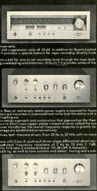Onkyo--A step ahead of State-of-the-Art.![]() State-of-the-Art is for everyone else. Onkyo design and construction is for tomorrow. Today. We don't just claim innovation, quality and value. We 3 rove it when independent test laboratories publish their unbiased reports in your favorite audio magazines. Of our TX-4500, one test report said ,':..one of the fines- receivers available today at any price:' Of our TX-2500, another said, "...sounds a good deal better than the data suggest-and better than one has a right to expect at S300:' If the data don't suggest the total quality, it may be e 'r e too cautious in our claims. But, we have other equipment too new to have been reported on as yet. All are built to the same exacting standards, featuring exclusive Onkyo advances. We'll try to be a bit less modest as we tell about: Quartz-Locked Tuning--This is the tuning system of which the most famous testing lab said, '...a new system that completely eliminates tuning errors in FM reception:' This is done by using a quartz crystal oscillator which takes advantage of the unique capability of precisely ground quartz to maintain a fixed frequency. The Quartz-Locked circuitry compares the tuner's IF frequency with the .frequency generated in the Quartz-Locked oscillator, continually compensating for frequency differences that would cause distortion or poor reception, and additionally compensating the FM-tuning meter at the same time. Servo-Locked Tuning--An economy version of the Quartz-Locked system with similar characteristics in a different configuration. While essentially an automatic frequency control circuit, Servo-Lock is more sophisticated in design and performance and in actual lab tests has held stations for at least 24 hours without perceptible drift. Quartz-Locked AM/FM Stereo Receiver TX-8500---Power output 110 watts per channel, minimum RMS at 8 ohms, both channels driven from 20 Hz to 20- kHz with no more than 0.1% Total Harmonic Distortion. Direct coupled differential pure complementary main amplifier with ultra wide frequency response, 2 Hz to 60 kHz t 1 dB at main amp. Total Harmonic Distortion less than 0.1% at rated out put; 0.08% at 1 watt output. Rated FM sensitivity 1.7 µV (mono), 4 µV (stereo). 50 dB quieting sensitivity 3 µV (mono), 35 µV (stereo). Image rejection ratio 83 dB; alternate channel selectivity 70 dB; IF rejection ratio 100 dB. S/N ratio 70 dB (mono), 65 dB (stereo). TX-4500-Power output 55 watts per channel, minimum RMS at 8 ohms, both channels driven from 20 Hz to 20 kHz with no more than 0.1% Total Harmonic Distortion. Direct coupled differential complementary main amplifier with ultra wide frequency response, 2 Hz to 80 kHz-1 dB at main amp. Rated FM sensitivity 1.8 uV (stereo). Image rejection and alternate channel selectivity 70 dB. IM distortion 0.3% at rated power; 0.1% at 1 watt output. Servo-Locked AM/FM Stereo Receivers TX-2500-Power output 27 watts per channel, minimum RMS at 8 ohms, both channels driven from 40 Hz to 20 kHz with no more than 0.5% Total Harmonic Distortion. Direct coupled differential main amplifier with frequency response of 2 Hz to 60 kHz 1 dB. Total Harmonic Distortion no more than 0.5% at rated output; 0.2% at 1 watt output. IM distortion 0.5% at rated power; 0.3% at 1 watt output. Usable sensitivity in FM, 2 µV (mono), 5 0V (stereo). Image rejection 45 dB; alternate channel attenuation 60 dB; S/N 65 dB (mono), 60 dB (stereo). IF rejection 80 dB. TX- 1500-Power output 15 watts per channel, minimum RMS at 8 ohms, both channels driven from 20 Hz to 20 kHz with no more than 0.5% Total Harmonic Distortion. Direct coupled differential amplifier with overall frequency response 20 Hz to 20 kHz 1 dB. Total Harmonic Distortion no more than 0.5% at rated power; no more than 0.3% at 1 watt output. Usable FM sensitivity 2.3 µV (mono), 5 µV (stereo). 50 dB quieting sensitivity 4.5,µV (mono), 50 µV (stereo). S/N ratio 65 dB (mono), 60 dB (stereo). IF rejection 80 dB. Alternate channel attenuation 60 dB. All of Onkyo's receivers feature multiple speaker outputs as well as multiple tape inputs and outputs including tape to tape dubbing. All are built to specification which often exceed their price ranges with special features, including Phase Locked Loop Multiplex. Quartz-Locked AM/FM Stereo Tuner Solid State Integrated Amplifiers What does it all mean? You've read a lot of our claims-understated though they may be-and same of the claims made for us. But the best test is still your own ears. ![]() ----- Also see: |
