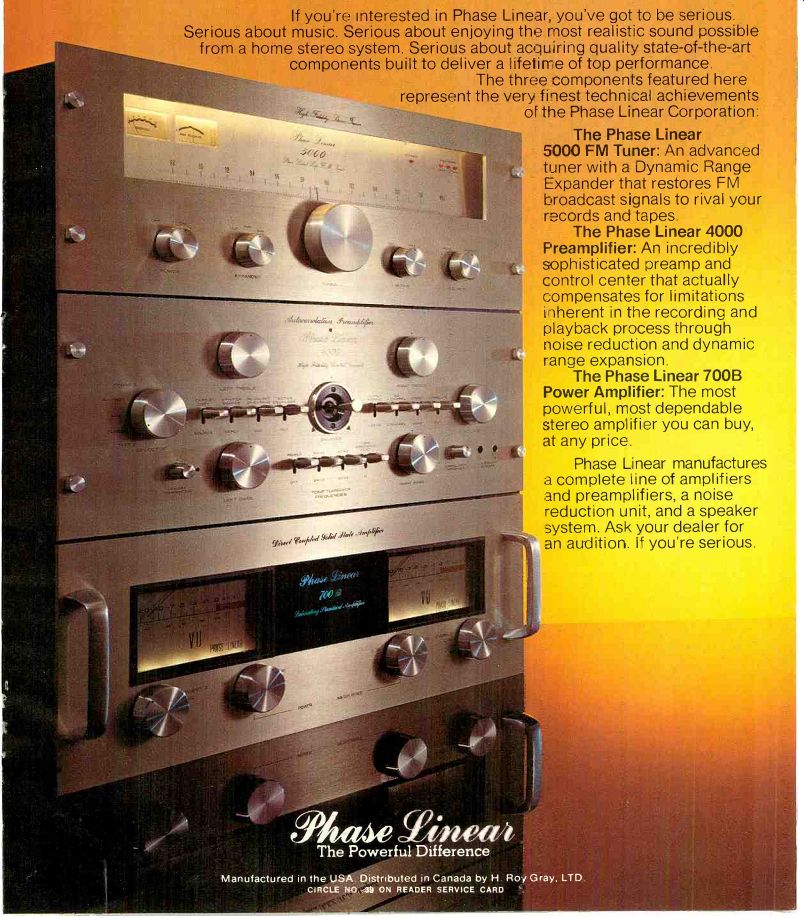 You've got to be serious.If you're interested in Phase Linear, you've got to be serious. Serious about music. Serious about enjoying the most realistic sound possible from a home stereo system. Serious about acquiring quality state-of-the-art components built to deliver a lifetime of top performance. The three components featured here represent the very finest technical achievements of the Phase Linear Corporation: The Phase Linear 5000 FM Tuner: An advanced tuner with a Dynamic Range Expander that restores FM broadcast signals to rival your records and tapes. The Phase Linear 4000 Preamplifier: An incredibly sophisticated preamp and control center that actually compensates for limitations inherent in the recording and playback process through noise reduction and dynamic range expansion. The Phase Linear 700B Power Amplifier: The most powerful, most dependable stereo amplifier you can buy, at any price. Phase Linear manufactures a complete line of amplifiers and preamplifiers, a noise reduction unit, and a speaker system. Ask your dealer for an audition. If you're serious. Manufactured in the USA. Distributed in Canada by H. Roy Gray, LTD.