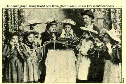 ONE HUNDRED YEARS OF RECORDING -- "If Edison hadn't invented the phonograph, someone else would have". IVAN BERGER ![]() --- Edison, father of the cylinder; Berliner, father of the disc. ONE HUNDRED YEARS OF RECORDINGBy Ivan Berger THOMAS ALVA EDISON was somewhat deaf. That didn't stop him. Perhaps it even made him extra-sensitive to what he did hear--and its implications. After all, hadn't he nearly invented the telephone? And hadn't he already made more money from telephone patents than Alexander Graham Bell, the man who had succeeded in inventing it in 1876, just one year earlier? Edison, Bell, and Elisha Gray were all starters in a race to be the first with one invention-a "harmonic tele graph" that could send several messages at once over one pair of wires and wound up racing to turn that idea into a telephone. Bell beat Gray to the patent office by mere hours, and Edi son didn't discover until too late that one of his attempts could carry voices, too. So when Edison's next telegraph invention, a dot-and-dash recorder, began to make a "humming sound, resembling human talk heard indistinctly" when played at high speed, Edison was ready at once to change direction toward something that would resemble human speech heard distinctly: the phonograph. From History's standpoint, he needn't have bothered. If Edison hadn't invented the phonograph, someone else would have--and soon. Charles Cros, a French amateur scientist, photographer, and poet, had already conceived of a working phonograph some months before. But, perhaps because he was a poet, he lacked either the money or the technical ability to actually construct one. He safeguarded his place in history (but little else) by depositing his idea with the Academie des Sciences, and it would be ten years before his ideas would be fully implemented. Edison had invented and built the first recorder, but Cros, for all the good it did him, had invented the flat, replicable disc. The phonograph actually spoke, shocking Edison almost as much as word of it would later shock Cros. Edison was no great sophisticate, but even he might have chosen more historic words for the first test than "Mary had a little lamb" had he expected History would hear them. "I was never so taken aback in my life," he later said. "I was always afraid of things that worked the first time." But Edison did not build the first "talking machine"--not even, as he is reputed to have jested later, the first talking machine that could be shut off. Nor did he, strictly speaking, build the first recorder. What he did build was the first machine that could record sound and then play it back again. Attempts at making machines that would talk go back in legend to the time of Roger Bacon and Albertus Magnus, and some semi-successful nineteenth-century attempts were well known (even Barnum got into the act). Machines that recorded sound visually went back at least to the late eighteenth century. In 1802, Thomas Young designed such a recorder using many of the techniques Edison re invented seventy-five years later, plus a parabolic recording horn better than Edison's conical one. And in 1857, Edouard Leon-Scott built a device that traced sound waves on smoke blackened paper. Edison’s phonograph was remarkably simple in construction. A spiral-grooved brass cylinder wrapped in a sheet of tin foil was turned by a crank while a needle mounted on a tele phone-like diaphragm embossed a record of its up-and-down movements onto the tin foil. The recording would wear out after only a few plays, and Edison himself later admit ted that "no one but an expert could get anything intelligible back from it," but no one questioned that it was a marvel. And it made money from the start. By January of 1878, a company had been formed to manufacture and exhibit the little wonder, and some exhibitors found that a single phonograph could earn them over $1,000 a week. Meanwhile, Edison kept working on his baby and coming up with fresh ideas. A patent application of early 1878 suggested such ideas as the disc phonograph (easier to attach the foil to, but suffering from inner-groove distortion), clockwork motors to re place the hand crank, electrotype duplication of the embossed foil, amplified cutting (by magnetic force or compressed air), noise reduction (by magnetic repulsion of a steel needle and an iron record), tape recording (but not magnetic tape), multi channel records (probably just to increase clarity and volume), electrical recording (though probably just for telephone use), and speaking toys. In an article that same year, he predicted such uses as dictation, talking books for the blind, elocution teaching, music, family voice albums, speaking clocks, language instruction, recording school classes for later review, and telephone recording. Others suggested that the new invention could preserve the voices of the dead (from its frequent mention this seems to have been a particularly powerful idea to Victorians), sound-effects records ("the puffing and rush of the rail road train ... "), audio complaint boxes, "musical kaleidoscopes" that would create new tunes by playing old ones backwards (another idea that seems to have caught the nineteenth century imagination firmly), recorded drama, and the voices of "great singers . . . put into the hand organs of the streets." Of course, the infant phonograph was not yet good enough to carry out any of these sound predictions. As one contemporary writer put it: The tone of the phonograph is usually rather shrill and piping, but ... The instrument, when perfected ... will undoubtedly reproduce every condition of the human voice. But it was not to be perfected soon. The novelty wore off, the crowds drifted away, and so did Edison, off to launch his ten-year effort to produce the electric light and the generating and power systems that would make it workable. By 1886, however, Alexander Graham Bell, his cousin Chichester Bell, and Charles Sumner Tainter had patente