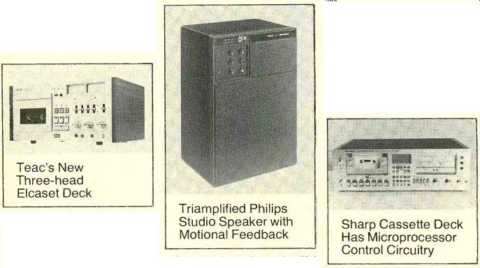NEW PRODUCTS: Roundup of the latest audio equipment and accessories.New Full-range Isolating Headphones From Superex ![]() Superex is launching a new line of stereo headphones with the SM-700 "Studio Master," a dynamic headphone using 2 3/4-inch Mylar-diaphragm drivers in vented enclosures. The 10-ounce headphone has Leatherette-covered foam cushions that rest on the ear, isolating it from outside sounds. The met al headband is also covered with foam pad ding, and a 15-foot extended retractable cable with a clothing clip is provided. The frequency response of the SM-700 is rated at 10 to 20,000 Hz ±3 dB. Distortion is rated at 0.25 percent for a 400-Hz signal at a sound-pressure level of 110 dB. A 0.6-volt (10-milliwatt) input is required to produce this acoustic output. Impedance is a nominal 35 ohms. Price: $65. Sony is offering three new quartz-controlled direct-drive turntables, the PS-X7 (shown), PS-X6, and PS-X5. Each has a quartz-crystal oscillator that generates a stable reference signal; this is compared with a signal derived from the platter's speed, and speed fluctuations are then corrected by a ser vo system. All three turntables are semi automatic and have a safety clutch in the tone-arm return mechanism. Operating controls (other than speed and record-size selection) are located on the front panel of the base and can be manipulated with the dust cover closed. The turntable bases are made of an acoustically inert material and mounted on liquid-filled feet to prevent acoustic feedback. The top-of-the-line PS-X7 features a car bon-fiber tone-arm shaft as well as a liquid-filled turntable mat. Both the PS-X7 and PS-X6 have an optical sensor- that triggers the tone-arm return mechanism as well as touch-sensitive front-panel switches for the start/ stop and repeat functions. Key specifications are identical for all three turntables and include 0.025 percent wow and flutter (wrms), better than 99.99 percent speed accuracy, and a rumble level of-73 dB (DIN B weighting). All three have approximate dimensions of 6 x 17 1/2 x 14 3/4 inches. Prices are $330 for the PS-X7, $275 for the PS-X6, and $230 for the PS-X5. Osawa announces two additions to its Sat in M-18 series of moving-coil phono cartridges. The M-18E and M-18X are basically similar to the M-I8BX cartridge already on the market but are lower in cost and have different stylus assemblies. The M-18 series cartridges do not require a pre-preamplifier ("head" amp) since they have rated outputs of 2.5 millivolts, suitable for a standard magnetic phono input. The M-1 8E and M-18X use the Satin's fixed-point pivot in the stylus-cantilever mechanism for improved groove tracing and a specially formulated viscous fluid for damping. The- M-18E, with a 0.2 x 0.8-mil elliptical diamond stylus, has a frequency response of 10 to 30,000 Hz. The M-18X is rated at 10 to 35,000 Hz and is intended for both stereo and CD-4 four-channel use; it has a 0.1 x 2.5-mil Shibata stylus. Compliance is 15 x 10-6 centi meters per dyne for each cartridge, and the recommended tracking-force range is 0.5 to 1.5 grams. Price of the M-18E is $195; of the M-18X, $250. Koss has taken the plunge into the dynamic-speaker market with three new systems de signed according to Thiele's vented-box loud speaker theory and using Small's computer methods to optimize parameters. The new line consists of the CM 1010, a passive radiator system, and the CM 1020 and CM 1030 (shown) ported systems. The CM 1030 is a four-way system with a 10-inch woofer, two 4 1/2-inch mid-ranges, and two 1-inch high-frequency dome drivers for the lower- and upper-treble ranges. Crossover points are at 400, 2,500, and 6,000 Hz. The system has dual ports for supplementing bass output. The high-frequency drivers are loaded with different phase plugs, which increase their efficiencies but restrict their bandwidths, so that one covers the 2,500- to 6,000-Hz range and the other is active above 6,000 Hz. There are three level controls on the CM 1030, for mid range, treble, and high treble. Each is a three-position switch with settings of +3, 0, and-3 dB. Overall on-axis frequency response in the far field is 26 to 20,000 Hz ±3 dB. Far-field response is down 3 dB at 70 degrees off-axis and 6 dB at 80 degrees off-axis. A sound-pressure level of 96 dB is produced at a 1-meter distance on-axis with a 1-watt input; Koss recommends amplifiers delivering between 15 and 200 watts per channel continuous power into 8 ohms. The speaker is fused to prevent overload. Nominal impedance is 7 ohms. The cabinet, which measures 39 x 16 1/2 x 14 1/2 inches, is finished in pecan veneer and has brass lift handles on the sides. The CM 1020 uses drivers similar to the CM 1030's but in a three-way configuration with one mid-range and one high-frequency driver. The CM 1010 is a two-way system with an 8-inch woofer and a 1-inch dome tweeter; its 10-inch passive radiator can be adjusted for flat response to 35 Hz or for augmented output in the 50- to 80-Hz range (with the rolloff occur ring at 40 Hz) using a removable weight attached to the center of the diaphragm. Both of these units are finished in pecan veneer. Price of the CM 1030 is $395; of the CM 1020, $295; and of the CM 1010, $195. ![]() IMP Teac's New Three-head Elcaset Deck Teac's new elcaset deck, the AL-700, is a three-head, three-motor machine employing the new quarter-track, two-channel cassette format. The AL-700, like other elcaset machines, has a detector that automatically senses tape type (ferric, ferrichrome, or chromium-dioxide) according to coded notches on the elcaset shell, and it sets bias and equalization accordingly. The transport can be started automatically with a timer, and a photoelectric sensor detects the end of the tape and disengages the transport mechanism. A memory function for tape stop and replay is also included. The AL-700 has built-in Dolby noise-reduction circuitry; in addition, it will inter face with an external compander and has a 