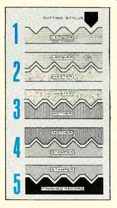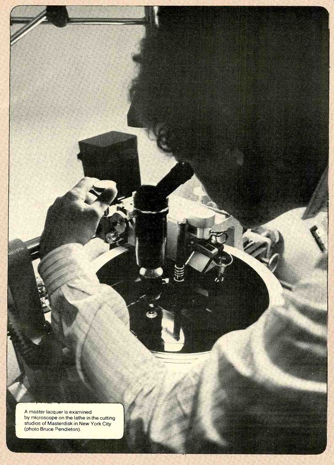 The intention in disc mastering is to put as high a sound level ("volume") on the record as possible without distortion and without cutting into the aluminum or causing the stylus to lift away from the lacquer surface. As straightforward as this sounds, it re quires a few hundred thousand dollars worth of equipment, and someone who really knows what he is doing, to accomplish properly. We found that the latter is usually harder to come by than the former! Because the lacquer material is soft, you cannot play the master lacquer (to determine whether the cutting job was done properly) without ruining it. So you first cut a reference lacquer, which is identical to a master lacquer except that it is 12 inches in diameter instead of 14. This reference lacquer is then played to evaluate the cutting process. If it is okay, you go ahead and cut the master. The next step is the plating process. After the lacquers are cut, they are sent to the metalizing plant where they are electroplated. This results in metal "negative" copies, or "masters," of the master lacquer itself. Then, as a rule, metal "mothers" are made from the negative masters, also by electroplating. From the mothers are generated the "stampers" that will actually mold or "press" the records. What could-and does-go wrong in this relatively simple process? First, if you try to speed up the plating process, the metal particles build up at a faster rate than they should, and stresses develop that distort the groove detail, introduce noise, and even cause sonic "print through" onto adjacent grooves-in other words, groove echo. Groove echo can also result if the grooves are cut too close together, regardless what the plating speed might be. We encountered this problem very early in our recording career at a time when we knew nothing of the potential causes of such problems. Our first test pressing arrived from the pressing plant with a horrendous amount of groove echo. We frantically phoned the cutting people, who said that it couldn't have occurred during cutting and must have happened in the metalizing. We talked to the man at the metal plant, who admitted that there was a "slight chance" that it happened at their end, but chances were greater that it was in the cutting. And even if it was their fault, there was little or nothing they could do about it! In desperation we talked to the pressing plant and they said that it was probably in the cut ting-but perhaps it could have been in the plating. So where did we go from there? Back to the cutting studio to begin all over again. I might add here that numerous other things can go wrong in the metalizing stages as well, such as too high or too low a temperature in the plating bath, a disaster from which we were mercifully spared the first time around. To avoid other difficulties we support the practice of plating the master lacquers as soon as they are cut (in the same hour, if possible), because the lacquer has a tendency to "relax" after cutting, changing the shapes of the grooves and thus the sound to some degree. Our philosophy, therefore, is: plate immediately, but plate slowly.