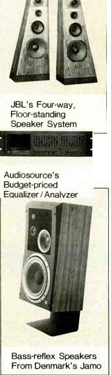 Low-distortion Sansui Receiver Has Equalizer The "Super-Feedforward" DC power-amplifier section in Sansui's Z-9000 microprocessor-controlled receiver is said to re duce all forms of steady-state and dynamic distortions. The unit is rated at 120 watts per channel from 5 to 100,000 Hz with total harmonic distortion of less than 0.005 percent. The preamplifier section includes a pre-preamp for moving-coil cartridges. Signal-to-noise ratio (S/N) of the moving-magnet phono section is 82 dB. The Z-9000 has a digital-synthesis tuner section with a S/N rated better than 80 dB. Usable sensitivity is better than 10.3 dBf, and distortion is under 0.05 percent. Sixteen presets are available ( eight AM, eight FM) as well as a choice of automatic or manual tuning and narrow or wide i.f. bandwidth. The built-in graphic equalizer is a seven-band model with a reverberation amplifier and adjustable 0-to 3-second echo decay. Other features include fluorescent peak-power meters, switching for three pairs of loudspeakers and two tape recorders, microphone mixing, a station-frequency display that doubles as a digital clock, and a three-memory program timer. Price: $950. ![]() Two Low-impedance Stanton Cartridges Stanton's new 885LZS (left) and 785LZE (right) low-impedance, low-output moving-magnet phono cartridges both in corporate a samarium-cobalt magnet attached to a specially developed cantilever whose material permits maximum stiffness with minimum moving mass. The 885LZS is designed for a tracking force of 3/4 to 1 1/2 grams and has a large-contact-area Stereohedron stylus. Output is 0.06 millivolt per cm/sec of recorded velocity. Frequency response extends from 20 to 40,000 Hz. Channel separation is given as 35 dB, cartridge inductance as I millihenry, resistance as 3 ohms. The recommended load impedance is 100 ohms or higher. Designed to track at the same force as the 885LZS, the 785LZE has a 0.2 x 0.7-mil elliptical stylus and a 30-dB separation specification. Both cartridges weigh 5.5 grams, come with a Stanton long-hair record brush, and have user-replaceable styli. Prices: 885LZS, $150; 785LZE, $100. LaserDisc Player Has CX Decoding Pioneer Video's top-of-the-line LD-1100 laser-optical videodisc player includes a CX noise-reduction / dynamic-range-expansion system for use with CX-encoded videodiscs. Properly decoded, such discs are said to offer an audio signal-to-noise ratio greater than 70 dB and a frequency-response range of 40 to 20,000 Hz. The LD-1100 comes with a handheld infrared remote-control unit for audio switching, random access to individual videodisc chapters or frames, scanning, fast forward or reverse at three times normal speed, slow motion, and step- and freeze-frame display. It also has pause and play controls and a reject switch for changing videodiscs. The front panel of the player duplicates most of the controls on the remote unit. It also has the power switch, a CX on/off switch, and a variable-speed control for the slow-motion mode. Audio-output connections are made with stereo phono jacks on the rear panel. Both r.f. and NTSC video outputs are provided. Dimensions are 20 3/8 x 5 5/8 x 15 3/4 inches. Price: $800. Pioneer Video, Inc., Dept. SR, 200 West Grand Avenue, Montvale, N.J. 07645. Yamaha's Low-profile Turntable Line Yamaha's new P-200, P-300, P-500, and P-700 turntables all feature low-profile styling, smoked-plastic dust covers, and improved versions of Yamaha's "Optimum Mass, Minimum Resonance" straight tone arm. The tone arm has been simplified and modified for a damped resonance frequency designed to fall near 12 Hz with most phono cartridges. The P-200 is a belt-drive semi-automatic unit, the P-300 a direct-drive semi-automatic model, and the P-500 a direct-drive fully automatic turntable. The P-700 (shown) has a quartz-regulated-PLL direct-drive mechanism, fully automatic operation, light-touch front-panel controls, and two lightweight headshells. Wow-and-flutter is given as 0.015 percent (wrms); signal-to-noise ratio is 78 dB. Weight is 13 1/4 pounds. Dimensions of all four new models are 17 1/4 x 4 3/8 x 14 7/8 inches. Prices: P-200, $150; P-300, $190; P-500, $220; P 700, $270. Computer Controls JVC's Top Tuner The T-X55 quartz-locked digital-synthesis AM/FM stereo tuner from JVC features automatic computer-controlled optimization of reception and newly developed circuitry for improved performance. When tuning in a station, the built-in microcomputer measures the signal strengths of the desired station and of adjacent stations that might interfere with reception. It then adjusts antenna attenuators, i.f. bandwidth, and stereo blend for best reception. The circuitry includes a gallium-arsenide field effect-transistor (FET) mixer for reduced station cross-modulation, a high-Q varicap in the front end for improved selectivity, a non-multiplexed drive of the front-panel display for lower noise, and a new quadrature detector and balanced AM mixer. Other features of the T-X55 include eight FM and eight AM station presets, an AM sensitivity switch for improved AM reception, a recording calibration-tone switch, manual override of the computer-set parameters, a digital r.f. field-strength display (which doubles as the station-frequency indicator), a six-broadcast programmable-timer recording function that makes possible the sequential recording of different stations, and a detachable AM loop antenna. FM specifications include a mono usable sensitivity of 10.3 dBf (0.9 microvolt, or µV) and a 50-dB-quieting sensitivity of 31 dBf (9.8 µV) in stereo. The A-weighted stereo signal-to-noise ratio with short-circuited antenna terminals is 80 dB. At 1,000 Hz, total harmonic distortion in stereo is 0.07 percent. Alternate-channel selectivity and image-response ratio are both 80 dB. Capture ratio is 1 dB and stereo separation at 1,000 Hz is 50 dB. Frequency response is given as 30 to 15,000 Hz +0.3,-0.8 dB. In AM, usable sensitivity is 20 µV with an external antenna, total h