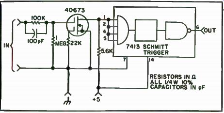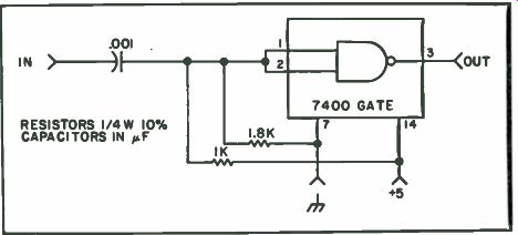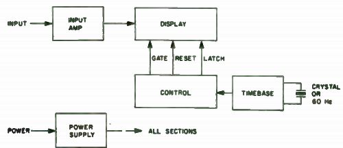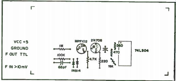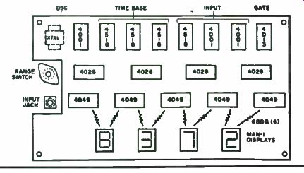 ... you do a great deal of measuring at low frequencies, you should consider a counter with a 10 second gate time, or a unit with a frequency multiplier, notably the Heath IB-1103. They will give you a display such as 60.1 Hz ( 10 sec TB) or 60.030 Hz (IB-1103). Display. The display on a counter can have a powerful bearing on whether you buy a certain model or pass it up. Important things here are the appearance of the digits and the number of them. LED type displays currently reign supreme in counters, so this is mostly what you'll see. Nixie tubes are seen in some older AC-only counters, but their use is dying out. Liquid crystals show promise for the future, because they don't require the high current of LEDs and the high voltage of Nixies. When you shop, look for the largest and brightest display you can get, but do not let the appearance of the display bias your thinking. Accuracy and sensitivity are far more important in determining your choice. The number of digits should be considered, also. As a rule of thumb, five to six digits are about the optimum number. Fewer (such as the three digits found on an inexpensive kit) require complicated range switching or more knob turning for you. And more digits can be confusing to read. Ever see 146.96 MHz read out on a large counter as 146960001 Hz? It's very confusing at times. Also, large digit counters consume larger amounts of power; consider that if you are buying an AC/battery model! Power Supply. Some counters offer you different ways to power them selves, often at no extra cost. The most common power source is 120 volts 60 Hz. You'll find many units that can be wired for 240 volts AC, but you may have to check the operator's manual to find this out. There are also counters that have 120v plus 12v DC connections. You can often plug them into a cigarette lighter for working on mobile electronics. A few battery operated counters are becoming available, but at present none have the full features of the other models. Special Features/Options. A whole plethora of special features are available on counters. Switching ranges from a simple kHz/MHz switch to a full blown range switch of 0.01 ms to 10 sec. Inputs range from simple jacks to complicated attenuators and trigger level controls. Input impedances may be different, too. You'll find the standard 1 meg plus 10 to 50 pF input and a straight 50 ohm input (for VHF) on some units. Some of the more expensive units have timers/stopwatches and time interval measuring features built in. And the list could go on. Base your selection on what features you really need and not what looks nice. It makes no sense to buy a $300 counter/ timer, then use the timer once and spend the rest of the time measuring frequency! Most options can be quite useful. Some popular options include frequency range extenders, high stability TBs, power cords, etc. Also, don't overlook good probes and cables. A x 10 scope probe is often used with the standard 1 meg input counter and will increase the maximum input voltage 10 times, preventing overload in most cases, and making connection to the equipment under test much easier. Needless to say, this is a very handy option and one that you should consider! If you feel that you must go for options, try to anticipate future needs. Sending a counter back to the manufacturer for modifications at a future date is usually much more expensive than ordering everything at the same time. Some Pitfalls. Let's wrap this discussion of counters up by briefly mentioning some pitfalls that can trap you. Here are some of the areas to watch. Accuracy specs are sometimes hard to find on a counter data sheet, and when you do find them, they may not be complete! Although the data sheet may say "Accuracy: 10 ppm," nothing is said about the temperature or supply voltage, all of which affect the accuracy slightly, If accuracy is important to you and you are in this situation, it may pay to contact the manufacturer. Input amplifiers also have questionable areas. The input circuit of counters without attenuators should have an overvoltage protection network, usually diodes. Check. If the counter doesn't have one, avoid it or you'll be doing a lot of repair work on the counter! Finish up your evaluation by looking over the counter for any other features that you think will cause trouble. If possible, try to get a "hands on" demonstration of the unit you select. Make sure that everything works to your satisfaction, and that the counter lives up to your expectations. A Fun Counter Project The goal in designing this counter was to produce an inexpensive, no frills, reasonably accurate, minimum parts design. High impedance FET input, . 2 to 30 MHz frequency range, sensitivity 60 mV RMS across most of its range, and compact packaging are some of its features. Also, two modes of timebase operation are possible: xtal controlled with an accuracy of ±20 PPM ±1 count and line frequency (± 0.05 percent). The heart of the counter (less readout and power supply) is mounted on 2 PC boards (=3" x 5"). The cost of the boards filled with parts (for line frequency operation) plus the six Minitron readouts will run you about $40. An additional $8 pays for the xtal controlled timebase, and of course you'll need a power supply. Any junk box parts substitute will naturally reduce your costs.