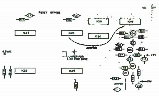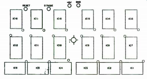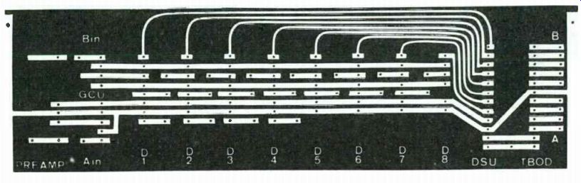General Construction and Testing. After etching and drilling all the boards, install the jumpers first because two on the GCU are under ICs. Next put in the resistors and capacitors, and then the transistors and ICs. The LED sockets on the DCUs come next; then install the LEDs. Install the sockets on the master board. Wire the power supply in the case, along with the front and rear connectors and switches. Secure the master board to the case with small angle brackets, at least 4" behind the front panel. This will allow the boards to be installed and removed easily. Or the master board may be hinged at the bottom to tilt back. Next do the main wiring from the power supply to the ...