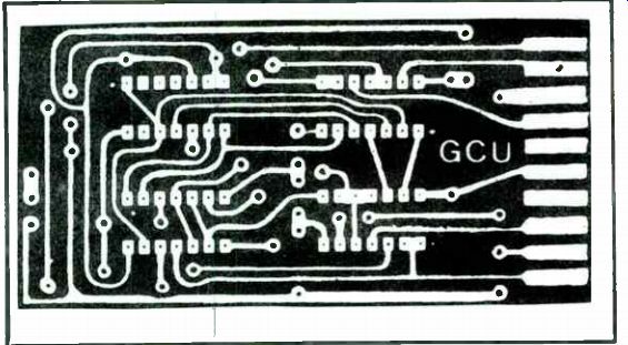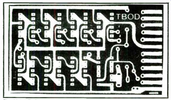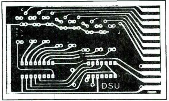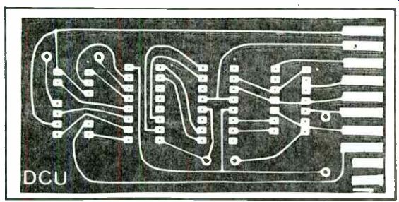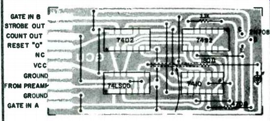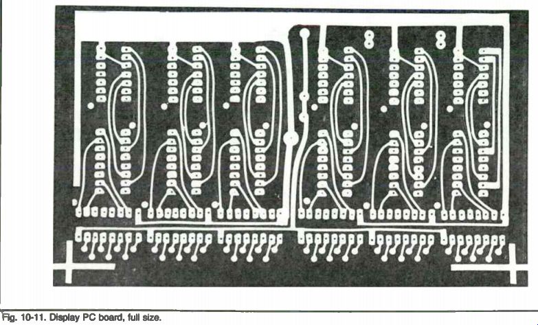 ...maximum current per segment would be 192 mils. But 10 percent of that is 19.2 mils and is within the maximum of 40 for the LED. The maximum current drain is now reduced to 134.4 mils when the display is showing an 8. Another change we made is the use of a 74LS90 as the first counter in the chain. The 74LS90 is pin replaceable for the 7490 and will count in excess of 50 MHz. Some designs use the 74196, which uses inverted logic as compared to the 7490. The 74LS90 uses the same logic so board design is simplified. We also added the option of selectable gates, 0.01 sec, 0.1 sec, 1 sec and 10 sec. Breaking the counter down into individual boards, there is the Time Base Oscillator and Divider (TBOD), Display Scan Unit (DSU), Decimal Counter Unit (DCU), Gate Control Unit GCU) and Preamp. All these units... ...plug into a master board which has all the interconnecting circuit paths etched into it. Approximate cost, less cabinet, is about $85 using all new parts, less if you have a well-stocked junk box and can make the boards yourself. Figures 10-30 through 10-48 illustrate this entire project. Timebase Oscillator and Divider. The TBOD is constructed on a PC board that is 3.5" by 2". Due to the compactness of the circuit it was necessary to use jumpers for the frequency outputs. A double- sided board could be made and eliminate that need, but in the effort for simplicity we decided against it. The TBOD consists of a 7400 NAND gate for the oscillator and a series of 7490s wired to divide by 10 in the bi-quinary mode. This method gives a symmetrical square wave at the output, needed for proper gate timing. Also, the divide by 5 signal is brought to the edge of the board, as these frequencies are also needed. 1000 Hz is also used by the Display Scan Unit, so it has two outputs. Curious as to the stability of this circuit since the crystal only has a tolerance of . 005 percent, we checked it against a 1 MHz signal with a known accuracy of 1 x 10. Provision has also been made for bringing the 1 MHz signal out to the back panel of the counter for checking it against another signal. This is also the most expensive of the units, costing about $15 with all new parts. Display Scan Unit The DSU is also built on a 3.5" by 2" PC board. The DSU has a 7492 divide by 12 counter wired to reset to 0 at the count of 10. The BCD outputs of the 7492 are connected to the BCD inputs of a 7442 decimal decoder, which is used to scan the display LEDs by switching the Vcc on and off through a PNP switching transistor. The emitters of the transistors are connected to positive 5 volts and the collectors are routed to the anodes of the LED display. Pull-up resistors are used to keep the transistors biased off, along with current limiting resistors on the bases. If 5 volts does not provide enough brilliance from the LEDs, a slight modification on the board will enable you to use more than 10 volts, however. More than that and the LEDs may burn out.