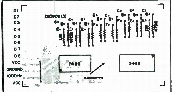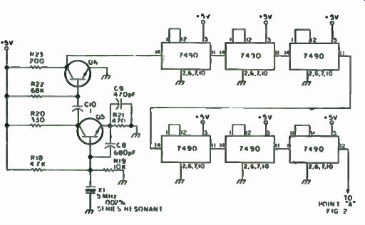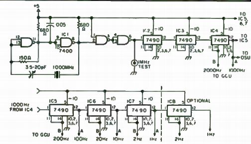 All that's left to do is recheck the TBOD frequency and button up. Troubleshooting. If you run into difficulty getting the oscillator to zero on exactly 1.000 MHz, try another 7400. Some will oscillate better than others. It has something to do with the characteristics of different batches. You can use a scope or another counter to check the divider chain for proper division. On the GCU, a dual-trace scope is nice because you can check and compare the waveforms at more than one point and reference them to another. Most problems here are caused by loose ICs in the socket. Actually, most problems can be cured simply by trying a different IC. If you still run into difficulty, look for solder bridges, bad connections, wiring errors, or even the possibility of a leaky or bad transistor. One can save in construction costs by not using sockets for the ICs, although it's a good idea to make certain the IC is good first. It's not fun unsoldering them. Do use sockets for the LEDs, though. The preformed ...