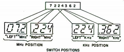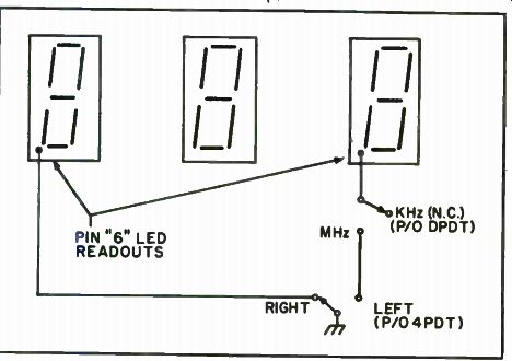 ---------- ![]() Table 10-1. Parts List. IC1 to IC6 7447 R11 24k IC7 to IC12 7475 R12 15 IC13 to IC18, IC21 7490 R14 4.7k IC24, IC25 74121 R15 1.5k IC22 7413 C1, C3, C4, C11 .1mF 20 V IC23 7492 C5 100 pF IC19 7402 C6 .001 mF 20 V IC20 74S73 C7 100 pF R16, R17 10k 1/4W Q1 MPF 102 R2 1 meg 02, 04 2N3638A R3 1.2k 03 2N2222 R4, R13 150 05, Q6 2N2222 R5 270 • IC terminals Molex Soldercon R6 3.9k Series 90 Minitron Display (6) R7 1.5k Note: Transistors, ICs, terminals R8 390 and display are available from R9 100 Digi-Key Corp. P.O. Box 126, R10 3.9k Thief River Falls, MN 56701. ----------------------- A $50 Self- Powered Counter To you this may look like another construction project. "A pretty neat little counter," you'll say. "Think I'll build one." Little will you know how long it took to get the bugs out and keep the cost down. This project is the pinnacle of savings. It is a 6-digit (that reads out to a full 8-digit capacity) counter, portable, hand-held, sensitive, rugged, LED readouts, requires no test equipment to build, and more, all for just a little over $50. Costs are sliced down to an absolute minimum by cutting all the frills. For instance, many counters advertise no-flicker, or non-blinking readout. This one blinks, but you can only see it on the lowest reading scale, when you are reading signals to 1 Hz. The rest of the time the digits blink for 1 ms, and when was the last time you could see a 1 ms blink? Most hobbyists will use the MHz and kHz scales most of the time anyway so the "blink" will be for 10 us and 1 ms respectively. And, when you are showing the XYL or neighbor your latest creation, show them on the Hz range so they will be impressed by the blinking, counting readouts! While cutting out the non-blinking feature does save some money, the greatest saver is cutting out 3 of the 6 digits! I know, you are wondering how it is that we get a 6-digit counter with 3 of the digits missing. At current prices, dropping 3 unnecessary digits saves nearly $25. Even at TWS a 3 DCU costs $ 18. So if you can liberate an extra $ 18 for this project, you can have all 6 digits! But it is all the more fun to drop 3 digits, build the unit in half the width and shift the readouts around to get a look at 8 digits of the incoming signal. Even in a 6-digit counter you have to shift the range switch around to get readout of say a 14.85 MHz signal to the nearest 1 Hz! With the handi-counter you have just one more shift to get the same capability with only 3 digits! The basic "brains" for the counter come order a digital dial kit from TWS Labs, PO Box 357, Provo, UT 84601 for $45.95. When you order the digital dial, you get the same stuff you would get if you order the individual kit (a 3 DCU and a timebase), but you get a free AC power supply in addition. In fact, you can power your unit from this supply if you don't want to add nicads like in this version of the handi-counter. Or you can keep the power supply and have a good source of fairly well regulated 5v DC for your workbench. The fact that the basic counter comes in kit form makes this project all the easier. All you need to do is make some very simple modifications to the kit, add the digit switching circuit, a couple of extra circuits on perfboard and you have an instant 3 x 6 digit counter! Operation. Let's look at how you use the unit before you build it. Actually, the principle of operation is very simple. There are several front panel controls. First is the on/off switch-a simple enough function. Second is the MHz/kHz selector (both these switches come with the kit); this one selects timebases and does some decimal point selection. We could have labeled it Hz/kHz like its 6-digit brothers; it would only have required putting the decimal points in some other places that were not convenient (and cheap) with this kit. The third switch, the one in the middle of the panel, we can call the "display selector" switch. This one comes from your corner Radio Shack and is p/n275-405, a 4 PDT switch that currently is priced 69 cents . Other than the box and batteries, this is the only expenditure that is not available in a kit. You could have a complete counter that would only read to 100 Hz so far. Back to the 4 PDT switch. It is used to select which 3 digits of the 6 available digits are viewed at any one time. When you throw the switch to the left, you see the left most significant digits and to the right, you see the 3 right most significant. The decimal point jumps around every time to keep you thinking straight. Figure 10-13 shows how it works. For an example, we used a 40 meter signal that is actually 7,224,362 Hz. This is how the counter sees it: Note the placement of the decimal point; also note that in kHz left and MHz right, the readout is the same, but the decimal point is shifted. That is because, if you look at the original signal you can see that there are: 7.2 MHz, . 224 MHz or 224 kHz (see, the readout means the same thing) and finally . 362 kHz. That last 0.362 kHz is the same as 362 Hz, but would demand another timebase switch position, so we merely switch a decimal point and call it a fraction of a kHz.