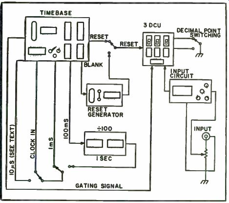 Suppose you hook the sensitive input circuit of the counter to an oscillator you built. You want a look at the output frequency of the oscillator. Maybe you see 21.8 on the MHz left setup; that means the oscillator is running at 21.8 MHz. If you were only interested in roughly knowing the MHz range of the oscillator, you would stop right there. If you wanted the kHz range you would leave the display left, and throw the timebase selector to kHz. That would give you a frequency check to the nearest kHz. Suppose you wanted further accuracy, or to know how much it drifts; then flip to the right digit display (still in kHz) and read out in Hz. You can see the flexibility of the whole thing! You have 3 digits in a lot smaller package, for a lot less cost and you are reading a 21 MHz signal out to eight places! Figure 10-14 is the block diagram of the counter and this will help you understand what is going on in there. The easiest process takes place in the kHz position. Here, the timebase selector and display selector switches choose to provide a one second (right) or a 1 ms (left) signal. This is high-accuracy stuff with the timebase being divided by a million to get the one second clock; any errors or drift in the timebase oscillator (already crystal-controlled) are divided by the million too. At the very beginning of the count time ( 1 sec or 1 ms), the timebase gives a reset pulse that starts the counter stages at 000. Then the counter merely counts the input pulses that occur during the selected time period. On the kHz left position, for example, the counter is cleared and enabled for one second. When counting a 60 Hz line input, the counter would start to flash (the part that will impress the average observer) until the end of the counting cycle when it will sit there displaying 0.060 kHz, or 60 Hz. When the display selector switch is pushed left, we apply a 1 ms gating signal to the counters and count the events that occur in 1 ms, or in other words, we count kHz. A 30 kHz signal will show up as 030. Note that there is no decimal point. There is no need, as the timebase selector is in the kHz position so it reads out as a whole number, not a decimal fraction. From the block diagram, when one switches to the MHz range, the clock now comes from 1 ms and 10 us. The 10 us clock is fed to the counter circuits in the "MHz left" position and merely allows the counter stages to count for 10 u-s. On this scale, the chance for error from the 1 MHz crystal is greater and the fact that the timebase is crystal-controlled becomes the greatest asset. At the 10 us point the clock signal is only divided by 10. With 10 us gating the counter can count up to 99.9 MHz; in real life the limit is imposed by the fact that the counter circuits will only operate to 30-40 MHz without a prescaler. Since most prescalers divide the display by ten, you will display MHz on all three digits, so the decimal point can be left out. It is probably a good idea to explain why there is a different reset circuit than the one with the kit. The reset circuit with the kit is designed to give high accuracy with fast input signals and operate at a 10 ms and 1 ms gating output. While the kit's reset is more accurate than the "extra one" built for the handi-counter, it causes some problems while running at slow speeds. The reset actually resets a couple of clock pulses before the gating signal enables the counter. That works great at 1 ms and 10 ms and means that you are not depending on the characteristics of the input impedance of a gate and some resistors and capacitors for your reset pulse; the pulse is clock controlled. The trouble comes when the clock is one second. The strobe circuit causes the counter to sample the input signal every second and a half or so and you can extend it to a few seconds by increasing the size of the timing capacitor in the unijunction oscillator circuit. Well, at one second clock speed, the counter resets to 000, waits a couple of clock pulses (seconds), then enables the counter stage and the stages count the input signal. After the one second counting period, it is time for another sample and the display resets again. The result is you don't have the display lit long enough with the number to even read it. You may choose to merely extend the sample time by putting more capacitance in parallel with the timing capacitor (33/4E) in the unijunction circuit that comes with the kit, or you may use the reset circuit shown here. The reset circuit built for the handi-counter works like this: When the enable signal goes active to allow the counter to count the input signal, a very fast RC differentiating network creates a narrow spike that resets the...
