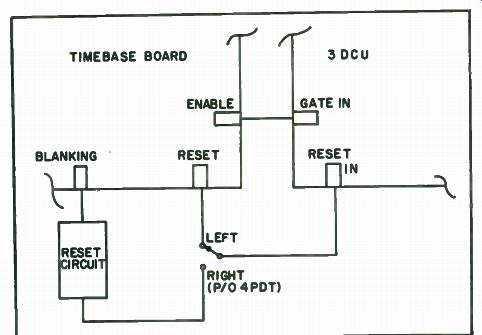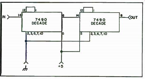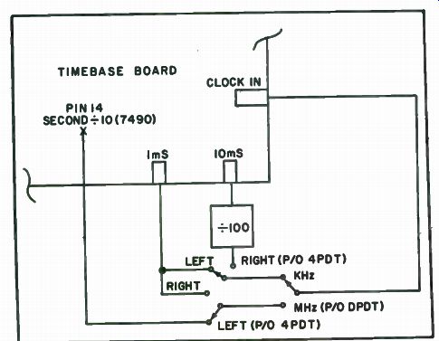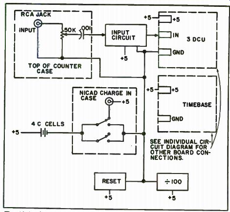 This circuit allows the counter to look at signals in the hundreds of cycles range and provides readout to 1 Hz. ... not touch the battery holders or the other circuits that are stuffed along with it in the battery cavity. Figure 10-15 is the schematic of the input circuit. Divide by 100, Extender Circuit. The 10 ms clock from the kit drives this circuit shown in Fig. 10-16. The output of the divide by 100 circuit is one second clock used in the timebase generator to make the one second enable signal for the counter. The circuit is very simple, and consists only of two decade dividers in series. Reset Generator. The reset generator is very simple; it consists of the RC network and a 7400 gate used as an inverter. Figure 10-17 is the schematic of the circuit. The output of the gate is a normal logic 0. When the sample signal comes along (actually the inverse of the signal called the blanking signal with the kit), it causes a positive pulse output and resets the counter stages. Because of the nature of this reset, as mentioned before, it is best not to use it (use " kHz left") when looking at very fast signals. On slower signals, there will be no difference in reading between this and the "MHz right" readings. Interconnecting the Circuits. Figure 10-18 shows the major interconnections and the hookup of the input circuit. First mount the 3 DCU counting and display unit on the front panel. Then run the power and interconnections as given in Fig. 10-18. Run 1" wires from the terminals on the 3 DCU card. These will connect later to the switch and the timebase board. Run the decimal point wiring to the switches on the front panel as shown in Fig. 10-19. Figure 10-20 shows how to connect the reset circuit to the timebase and 3 DCU boards. Figure 10-21 shows the hookup for the interconnecting wiring that does the timebase switching, including the divide by 100 circuit. When the wiring is completed, put an insulating card (a piece of 3" x 5" file card works great) between the 3 DCU and the timebase card. First mount the whole thing up and tighten down the mounting bolts. Then take the thing apart again and inspect the piece of card for punctures where a wire from the circuit board was too long or too sharp. Trim the faulty wires or pins, reinforce the card with a black electrical tape strip around the puncture (if any), add another layer of insulating card, and remount the boards.