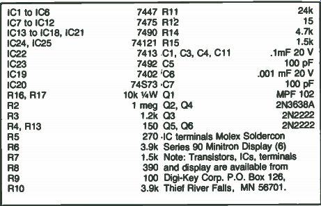 For a final check, make sure all ICs are installed correctly. That's another reason for using the Molex terminals. It's a lot easier to reverse an incorrectly mounted IC with them. There is no calibration procedure. It it's wired right, it'll work. One work of caution. If the counter fails to count all the way up to 30 MHz, IC21 could be the cause. It has to divide by 5 up to 15MHz. Substitute it with other 7490s until you get one that goes to 30 MHz on the input. Finally, your counter is compatible with any of the prescalers available on the market, extending its range to 300 MHz. For a complete parts list, refer to Table 10-1.