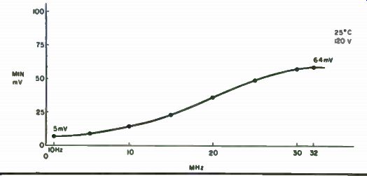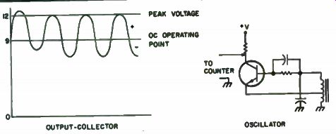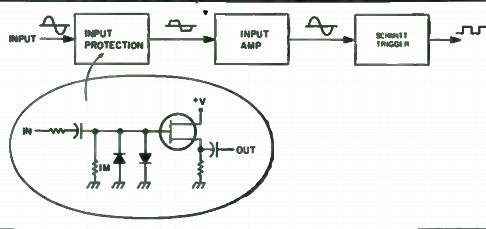 ...are not for serious electronics work; 0.034 percent accuracy is terrible in the counter world. Anyhow, the few units available with these may be off the market by the time you read this! Input Sensitivity. Another sign of a counter's quality is the sensitivity it has to measure the frequency under question. Figure 10-1 shows an input amplifier, the section that has to do with the input sensitivity, and Fig. 10-2 shows a block diagram. The job of the input amplifier is simple: It amplifies the input signal and converts the signal to a corresponding set of pulses that is necessary to drive the counter's digital circuitry. The heart of the unit is the Schmitt trigger; it converts the incoming signal, which may be any kind of a waveform, into the necessary digital square wave. Generally, when you read input sensitivity specs, you must assume that the sensitivity refers to the minimum signal required at the maximum rated frequencies of the counter to get a steady reading. In other words, the specs are worst case. Generally, the sensitivity of most counters in not flat over frequency, hence the min-signal-at-max-frequency bit. Figure 10-3 shows the sensitivity plot of the Gary Model 301 Counter, a 32 MHz unit. As you can see, the input sensitivity is not flat! But in this case, a non-flat sensitivity curve can work to your advantage. The high gain at audio frequencies allows use of devices such as microphones and magnetic pickups for organ tune-ups and tachometers. The lower gain at 32 MHz reduces the chance of overload by radio transmitters, too. Typical input sensitivity is on the order of 10 mV to 120 mV for most counters. It is desirable to get a counter with slightly more than enough sensitivity to do the job. In most labs, 100 mV worst-case does fine. You will also find a maximum input voltage spec on some units. This refers to the maximum voltage you can apply to the counter without dam age. This is always the peak AC signal plus any DC that may be present in the signal. For example, suppose you are measuring the signal of a homemade oscillator directly at the collector of the output transistor. You have, say, 9 volts DC at this point, plus, say, a 6v peak-to-peak signal: You are applying 9v DC + 3v peak or 12 volt worst case to your counter! Figure 10-4 illustrates this. This spec isn't really important to you unless you work around high voltage tube circuits and moderate to high power transmitters. In this case, there are counters built with range switches (usually calibrated x 1, x10, x100, etc.) for use around high voltages. Typical maximum voltages are 20 to 100 volts for counters without range switches and 500 volts for the ones with them. These voltages are rated at a counter's maximum rated frequency, where the maximum input voltage must be reduced to prevent damage to the input amplifier. At low frequencies, such as 60 Hz, most counters will handle 120 V ac without problem. Min/Max Frequency Range. This is probably the most advertised fea ture of frequency counters. Everywhere you look you are bombarded with ads screaming, "30 MHz Counter," "80 MHz Counter," "Or How About A 250 MHz Counter ..." and so on. Yet top frequency isn't all that important. A 30 MHz counter measures a 27 MHz signal as readily as an 80 MHz unit or even a 250 MHz unit or above. Yet, the price difference between these models can be at least several hundred dollars. All you are getting for the extra money of a faster counter is a unit with more capability. And that's fine if you sometimes need a counter to measure VHF signals; otherwise you can save money if you stick to a lower cost, lower frequency counter that will read the maximum frequency you expect to be working with. Remember, too, that low cost prescalers are available that divide the input signal by 10, so you can have your cake and eat it too! An often ignored spec is the minimum frequency a counter will display. This depends upon the timebase and the sensitivity of the input amplifier. In order to get any accuracy from a counter when measuring slow signals, at least 10 Hz must be displayed on the standard MHz range switch set to kHz (actually 1 second gate time). Why? All counters have a built in ±1 count inaccuracy due to the circuitry. That's 10 percent of 10 Hz-in other words, your 10 Hz is 10 percent accurate! Also, TB errors show up in these digits, and can worsen or even improve accuracy at this point. The input amplifier sensitivity may drop at this point, too, making it hard to pick up low frequency signals. It's safe to say that the low frequency limit of most counters is 50 Hz for good accuracy (5x the minimum frequency is good test equipment practice) even though the counter will read lower frequencies. If ...
