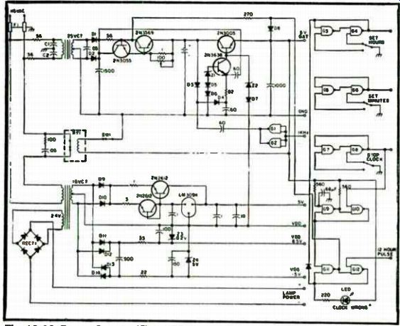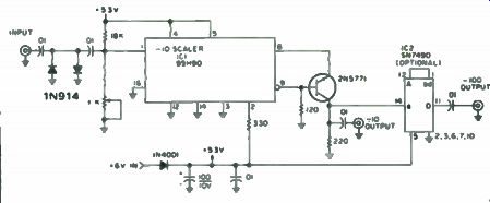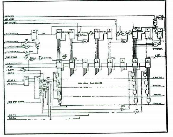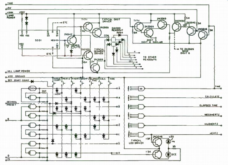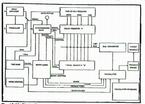 The Calculating Counter Traditional counters provide very limited resolution of audio frequencies associated, for example, with organ and piano tuning. The usual one second gate time yields a reading varying between "59" and "61" for 60 Hz. To determine this frequency with any accuracy, you must measure the period of one cycle ( 16,666 microseconds), reach for your handy pocket calculator, and calculate the reciprocal (or wait 100 seconds perhaps!). We decided to explore the possibility of teaching a counter to calculate frequencies from period measurements. It soon became apparent that designing a circuit to calculate reciprocals was no simple task. A ready-made solution to this dilemma presented itself in one of the "calculator chips" widely advertised at attractive prices. The "One-Chip Calculator" advertised as a type 5001 turned out to be both inexpensive and practical. The chip comes in one of two voltage ratings (for desk or pocket calculator use). While we used the low voltage model, which requires - 8.5 and - 13.5 volt power supplies, the higher voltage unit should be directly interchangeable, with minor power supply modifications. We wished to construct an all-purpose counter, and our final design includes a basic 30 MHz counter, a high frequency prescaler, a reciprocal calculator, a desk calculator, a digital clock, an interval timer and an incident counter. All logic circuits are TTL, except for the MOS calculator chip and ECL prescaler. Discrete devices are used for TTL/MOS interfacing and for driving readouts. Design, construction and debugging of a project of this magnitude is virtually impossible without a test-breadboard facility. It is necessary to breadboard each function, and test it in turn. A suitable power supply is also essential, and we recommend construction of the power supply first, but note that use of different readouts or other components may require modification of the power supply. Theory of Operation. Overall data and logic flow may be followed by reference to Fig. 10-22. The frequency to be counted is connected either to the input amplifier (high impedance) or directly into the prescaler (50 ohms). The prescaler is automatically activated in the MHz mode. Note that the high impedance input may be used in all count modes, and it provides good sensitivity through the two meter band. The synchronized input gate directs input pulses to register A, an 8 digit decade counter, and timing pulses to register B, a 6 1/2 digit counter. Gate time in kHz and MHz modes is one second (plus or minus one input pulse period), and in the Hz mode varies between 800 milliseconds and two seconds (800 milliseconds plus one input pulse period). When the input gate doses, entry logic is enabled, and in the kHz or MHz modes, the contents of register "A" are entered serially into the calculator, which displays the entry just as if it had been made from the keyboard. In the Hz mode, the contents of register "A" are entered, trailing zeros are padded to improve resolution and the "divide" function again activated. This sequence causes the number of input pulses stored in register "A" to be divided by the number of timing pulses stored in register "B". The result (with the decimal point appropriately positioned) yields the frequency of the input (with up to four decimal places!). The bus converter interfaces the TTL registers with the MOS calculator, and changes the BCD coding of the TTL to conform to the 5001 chip's requirements. The time-of-day register constantly contains the time, updated each second. Register "A" utilizes decade counters with preset inputs. In the time-of-day mode, once each second, the contents of the time-of-day register are strobed in parallel into register "A" and then serially entered into the calculator as in the kHz mode.